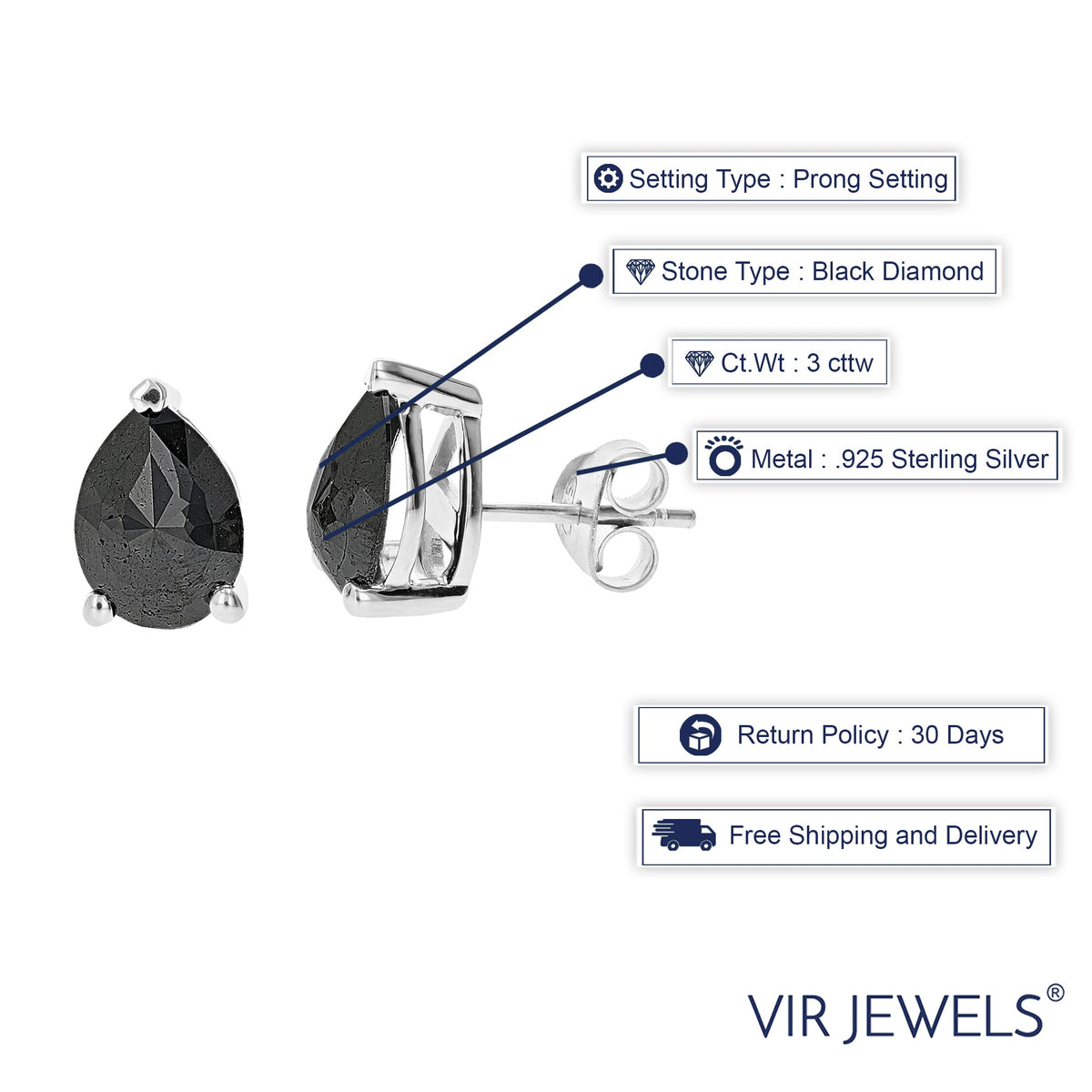 These 3 cttw Pear Shape Black Diamond Stud Earrings by Vir Jewels are a bold and dramatic addition to any jewelry collection. Featuring two stunning pear-shaped black diamonds, these earrings are expertly prong-set in sterling silver, allowing their deep, rich hue to take center stage. With their sleek and sophisticated design, these studs make a striking statement whether worn casually or for a formal occasion.