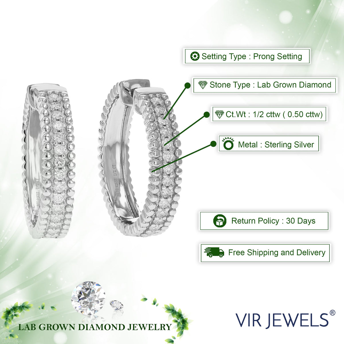 These 1/2 cttw Round Cut Lab Grown Diamond Hoop Earrings by Vir Jewels are a perfect blend of elegance and sustainability. Featuring 30 round lab-grown diamonds set in a prong setting, these hoop earrings provide a brilliant sparkle. The sterling silver hoop design ensures durability and a lasting shine. Whether dressing up for an evening out or adding glamour to everyday wear, these earrings are an ideal choice for any occasion.