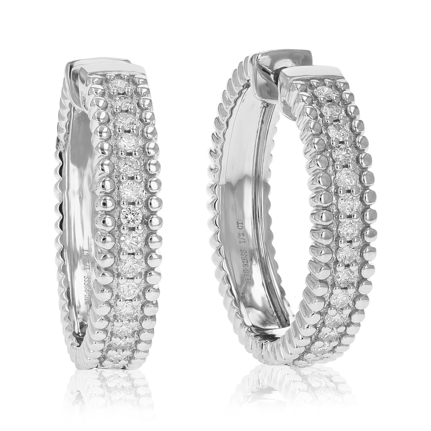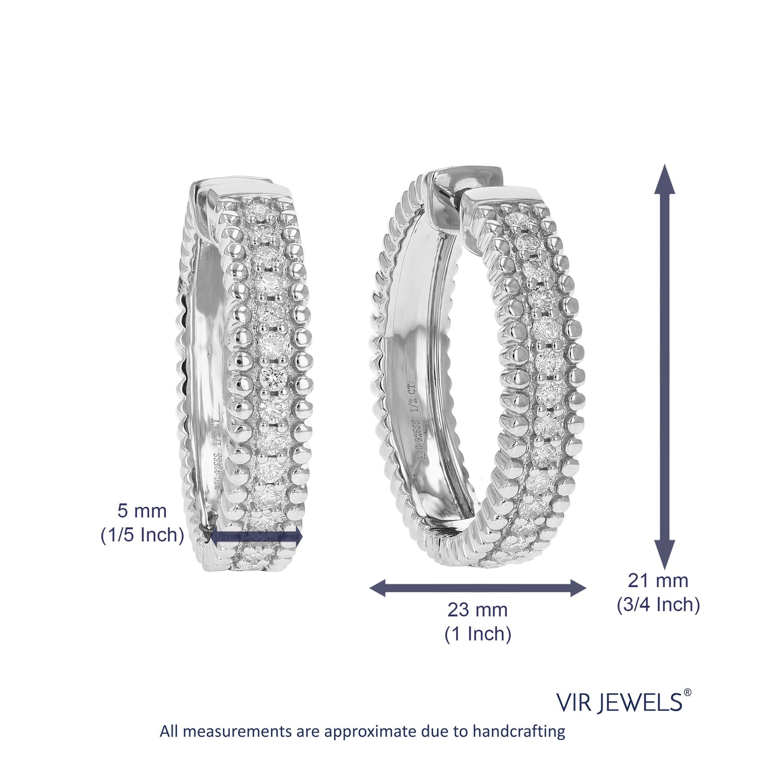 Crafted in .925 sterling silver, these hoop earrings feature 30 round lab-grown diamonds totaling 1/2 cttw. The diamonds are H-I in color and SI1-SI2 in clarity, set securely in prong settings. The earrings measure 21 mm (3/4 inch) in height and 5 mm (1/5 inch) in width, offering a chic and sophisticated design. Ideal for adult women, these earrings combine luxury, sustainability, and timeless beauty.