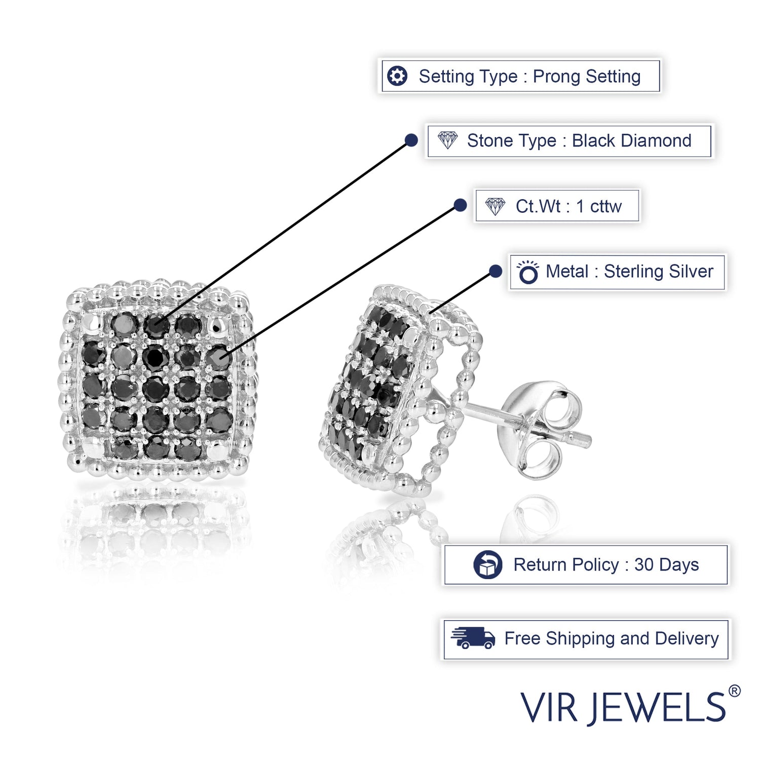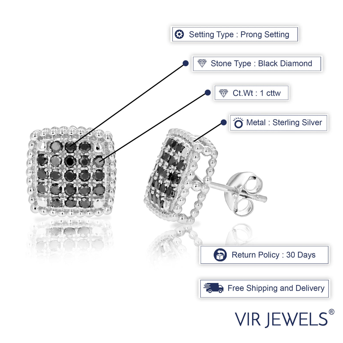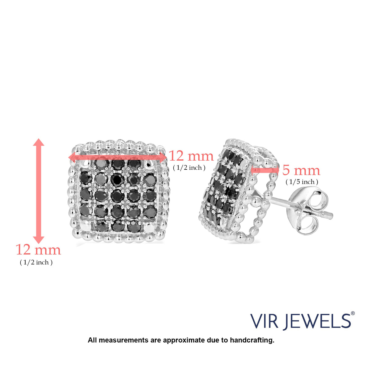 .925 Sterling silver with 42 natural round-cut black diamonds (1 CT total weight, I1-I2 clarity, heat-treated). Prong setting with post and friction back closure. Earring dimensions: 5mm width x 12mm length (1/2 inch).