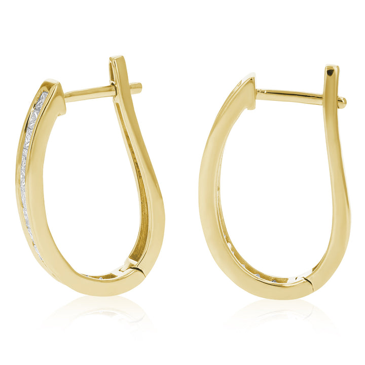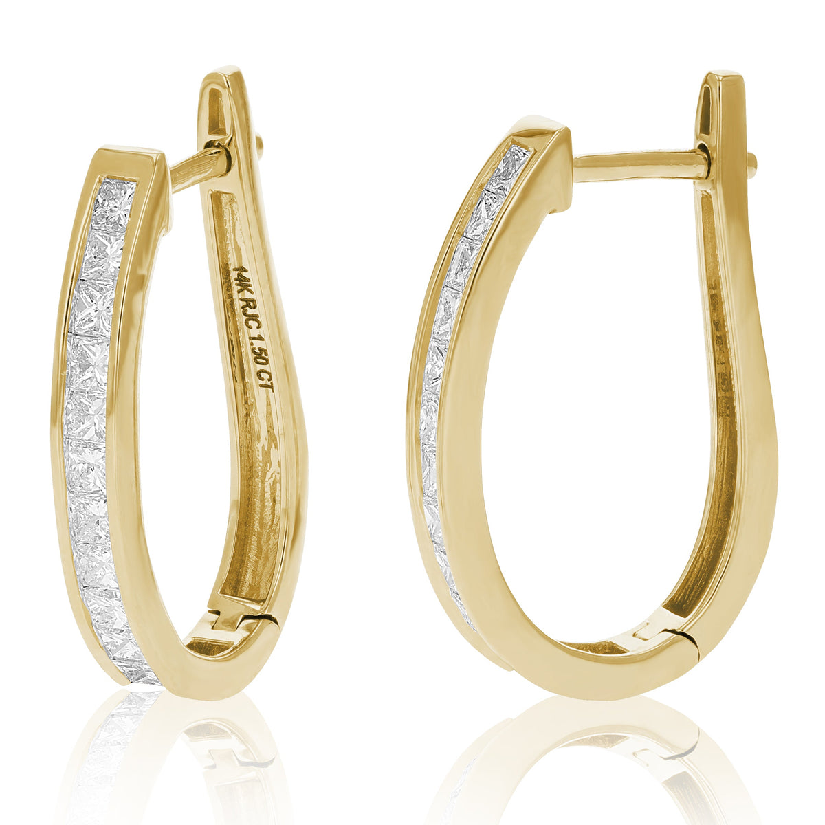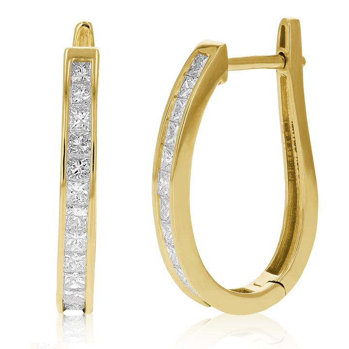 14kt yellow gold. 1.50 cttw of princess-cut diamonds. Diamond color: I-J. Diamond clarity: I1-I2. Hinge with notched post closure. Length: 0.66 inches.