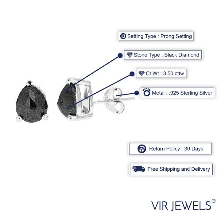 3.50 cttw Pear Shape Black Diamond Stud Earrings .925 Sterling Silver Prong Set
