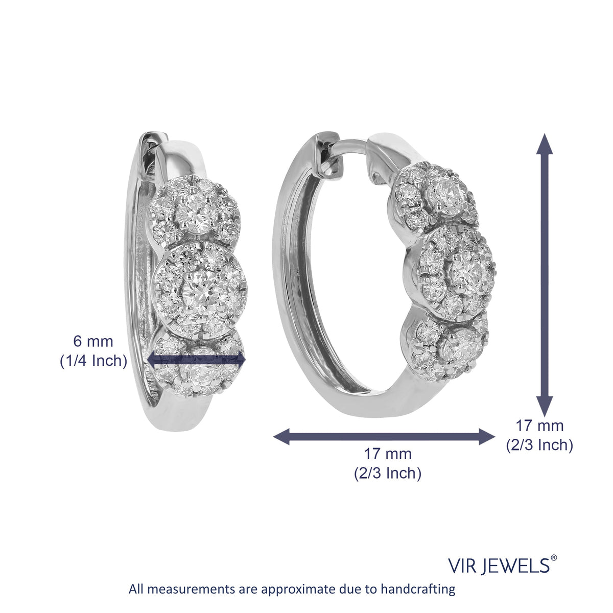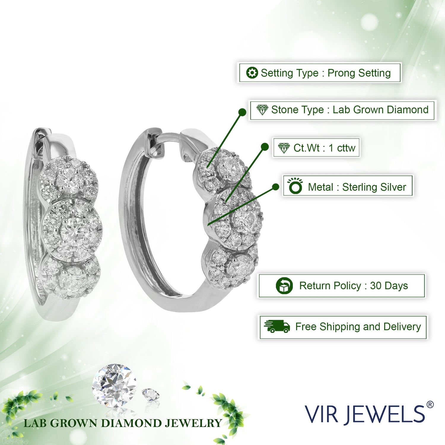 These 1 cttw Round Lab Grown Diamond Hoop Earrings by Vir Jewels feature 46 round lab-grown diamonds set in a prong setting. The durable .925 sterling silver complements the diamonds beautifully, creating a balance of style and sophistication. These earrings are perfect for elevating your look with a timeless and luxurious feel, making them ideal for both everyday wear and special occasions.