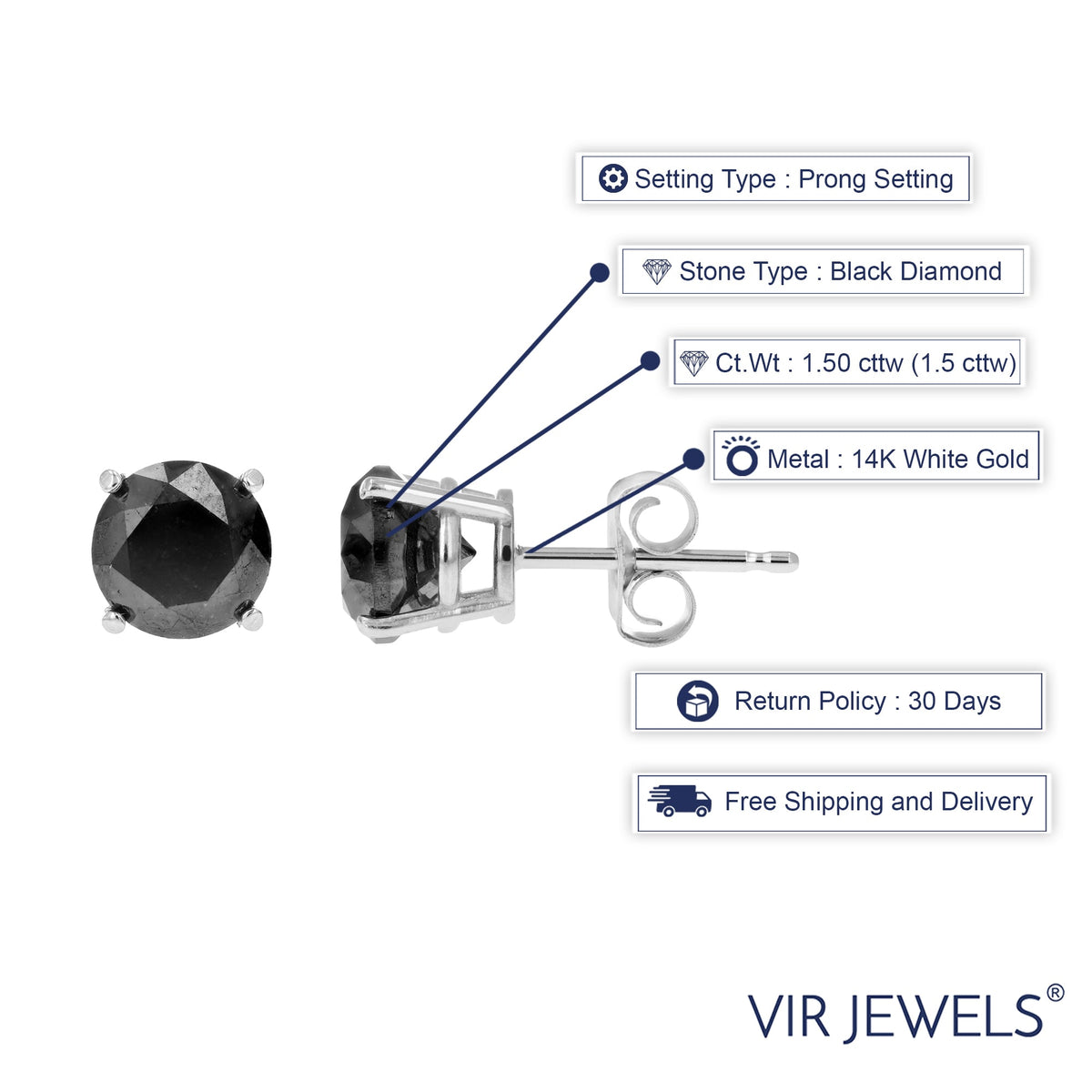 These 1.50 cttw Black Diamond Stud Earrings by Vir Jewels are crafted in 14K white gold and feature round-cut black diamonds, each set in a 4-prong basket setting. The diamonds are heat-treated to enhance their deep black hue. With a total carat weight of 1.50 cttw, these earrings add a bold, sophisticated touch to your look. Their push-back clasp ensures a secure fit, making them perfect for daily wear or special occasions.
