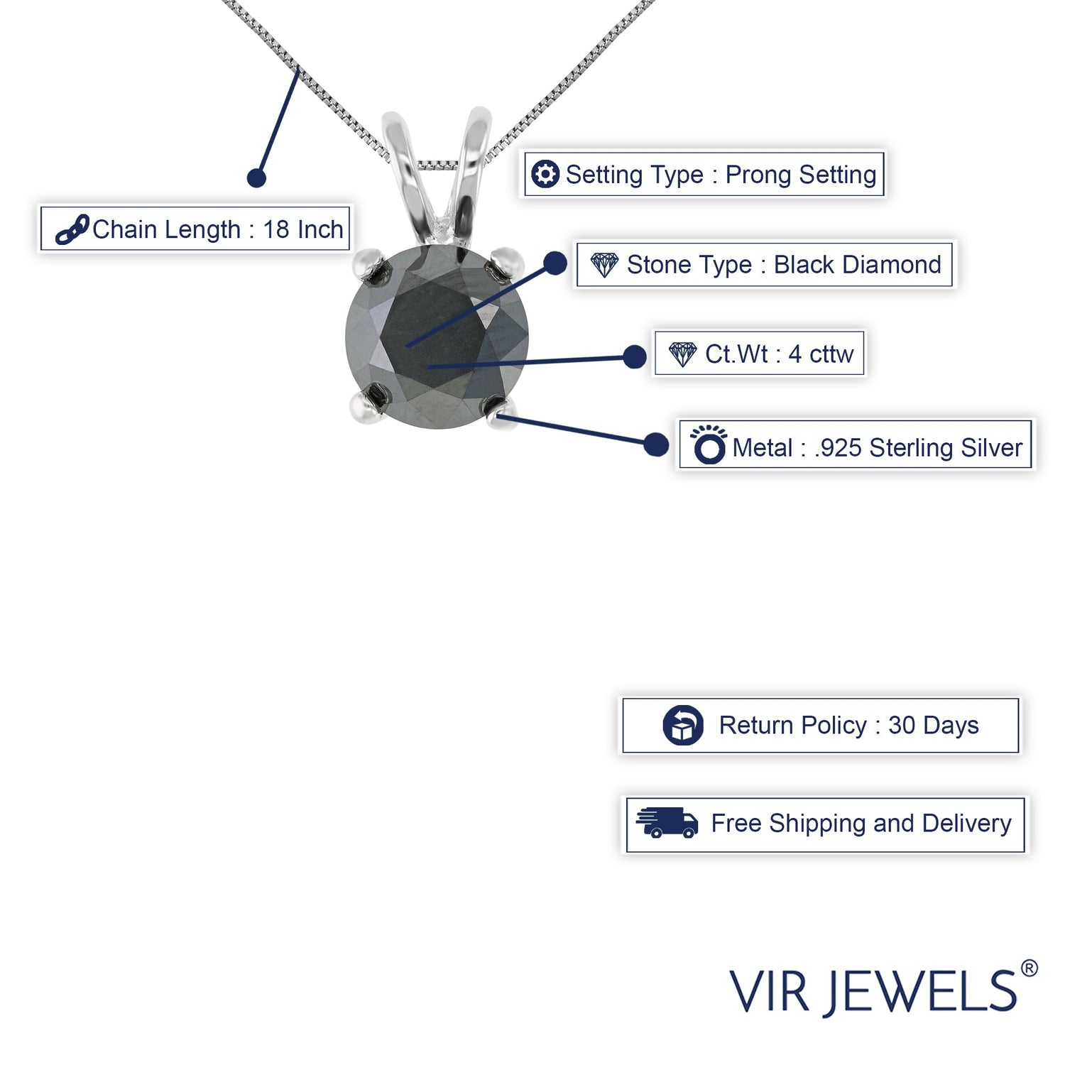 4 cttw Black Diamond Solitaire Pendant .925 Sterling Silver Round with Chain