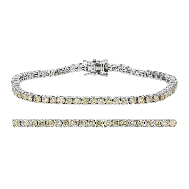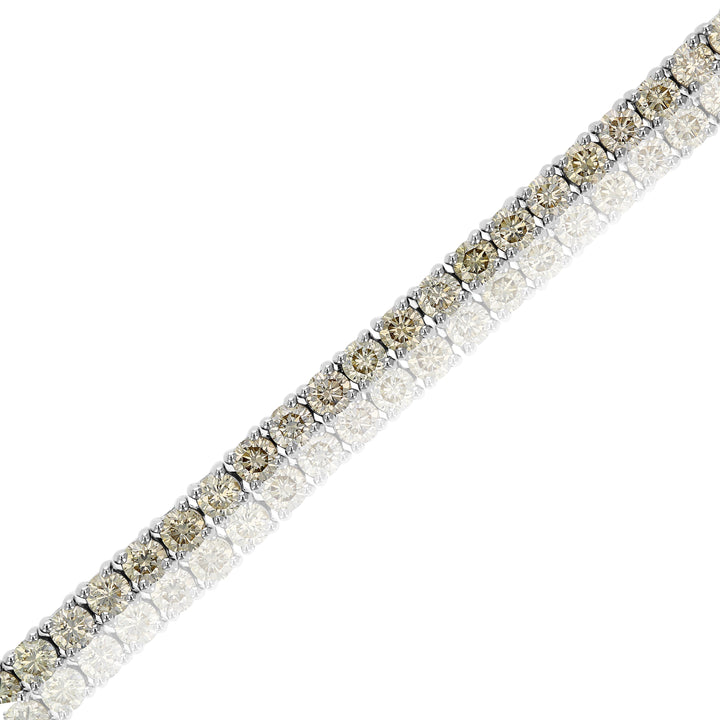 Crafted in 14K white gold, this tennis bracelet features 61 round natural diamonds with a total carat weight of 5 cttw. The diamonds are of SI2-I1 clarity and S-T color. The bracelet is secured with a box and tongue safety clasp.