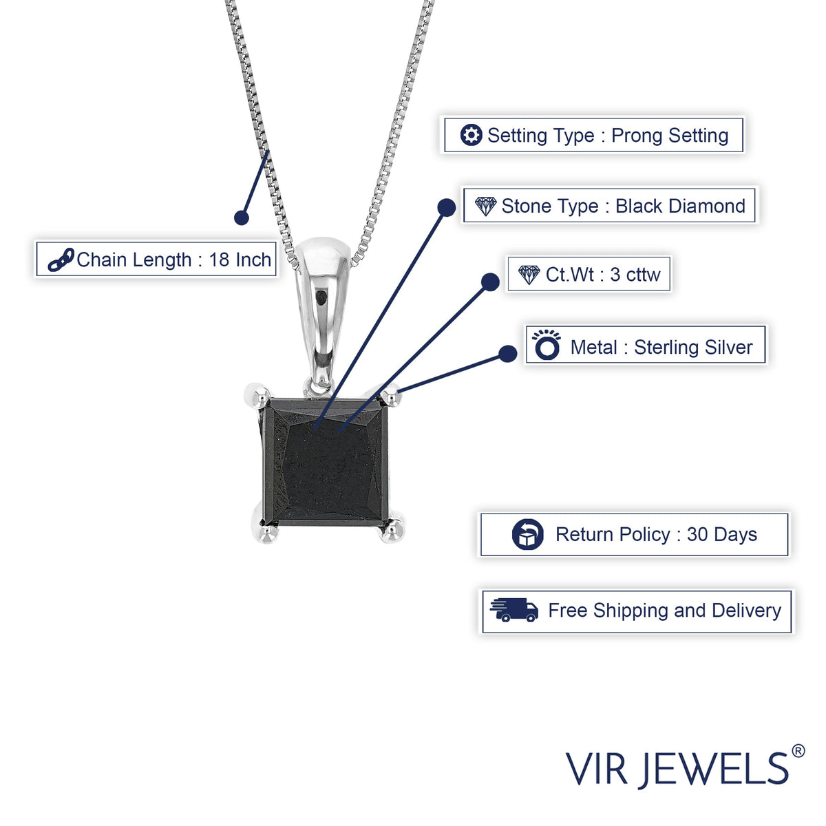 .925 sterling silver, 1 princess-cut black diamond, 3 cttw, I1-I2 clarity, prong setting, pendant dimensions: 7 mm width x 17 mm length.