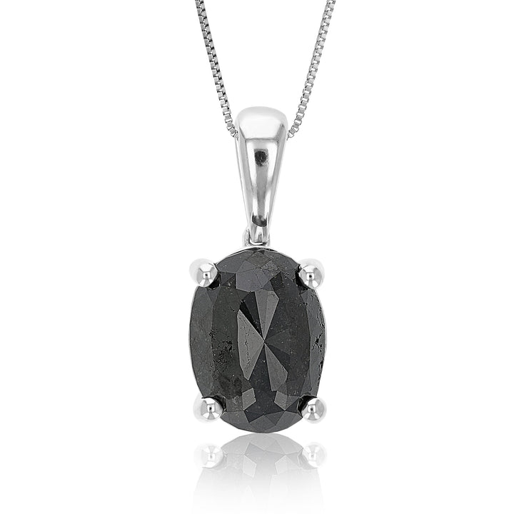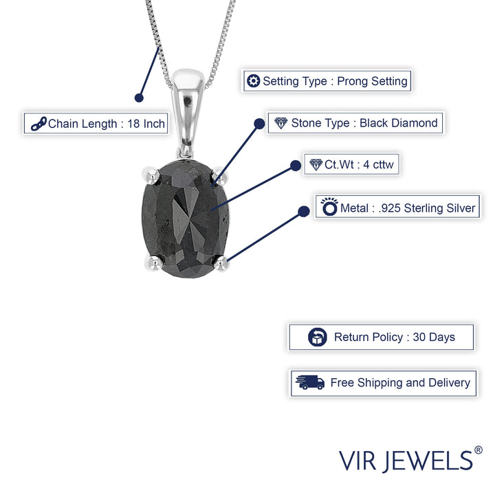 Crafted in .925 sterling silver, this pendant features a 4.00 carat oval-shaped black diamond with I1-I2 clarity. The diamond is set in a prong setting, allowing it to shine brightly. The pendant measures 21 mm in length and 9 mm in width, offering a perfect balance of size and elegance. The necklace includes an 18-inch sterling silver chain, designed for comfort and durability. Ideal for adult women, this pendant is the perfect gift or personal indulgence.