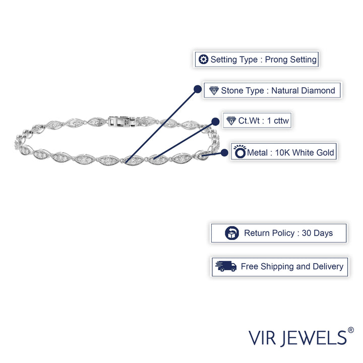 This 1 cttw Diamond Tennis Bracelet by Vir Jewels is a dazzling addition to any collection. Featuring 75 round diamonds set in 10K white gold, this bracelet is secured with a box and tongue safety clasp. The diamonds are of SI2-I1 clarity and I-J color, ensuring a brilliant sparkle. The bracelet's classic design makes it a versatile piece for any occasion.