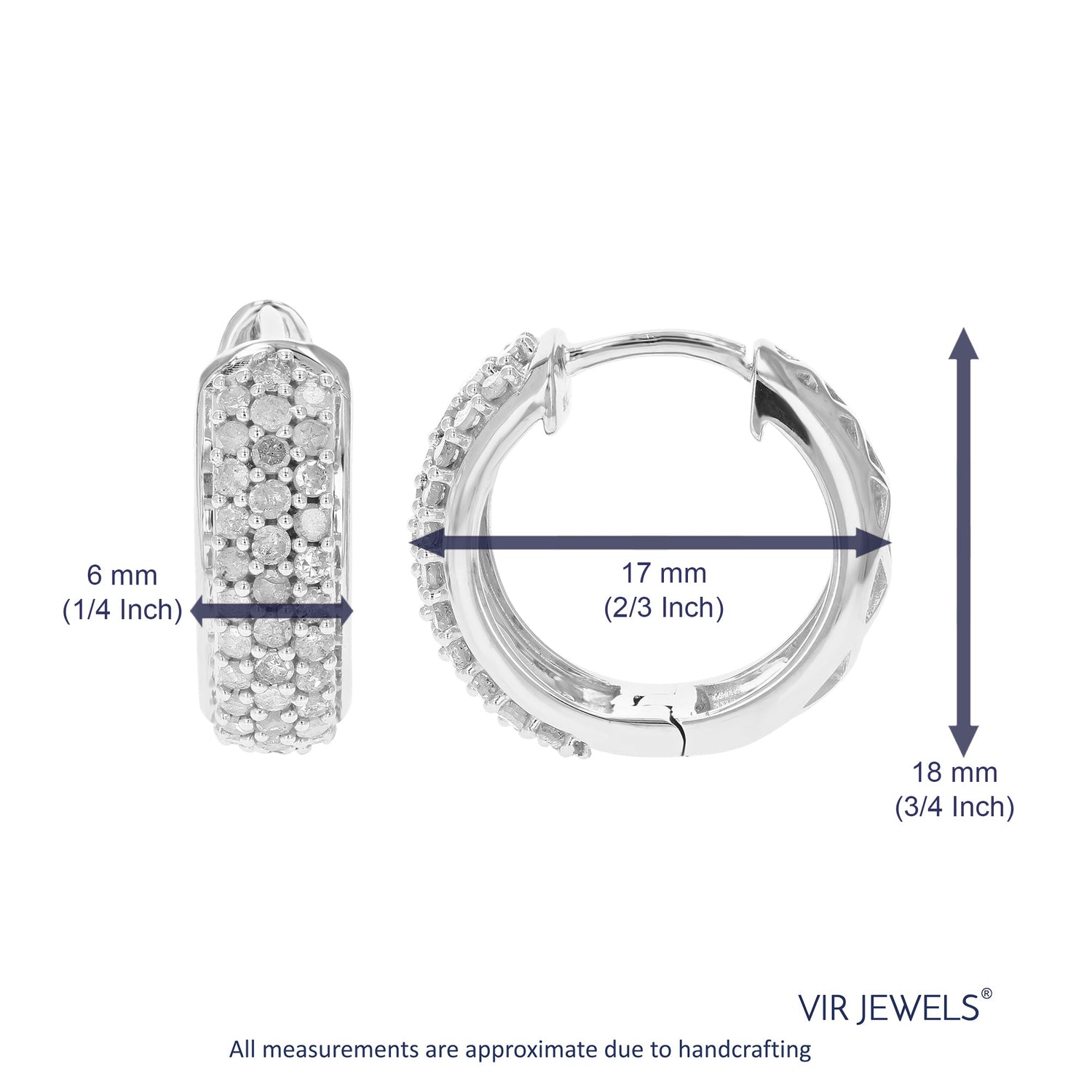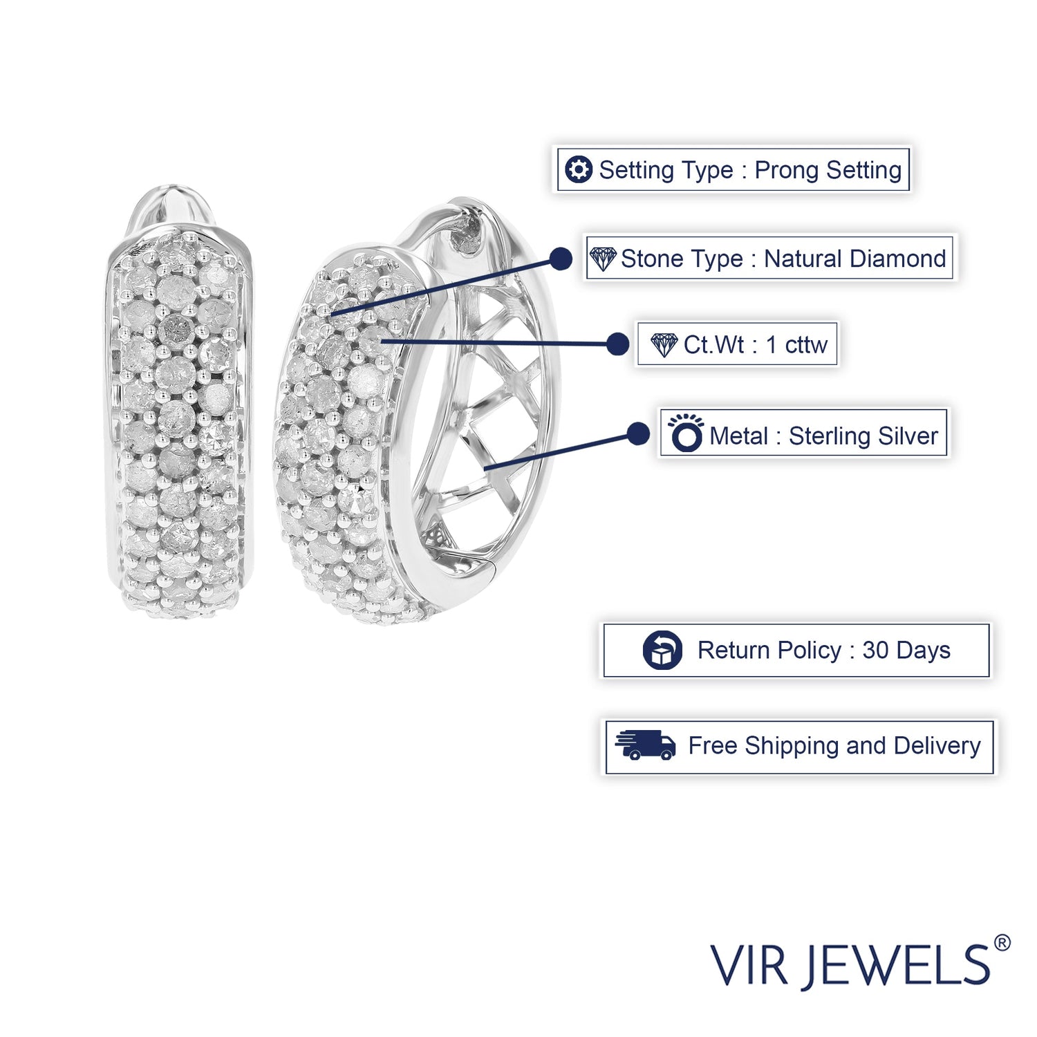 These 1 cttw Diamond Hoop Earrings in .925 Sterling Silver by Vir Jewels are a stunning addition to your jewelry collection. Featuring 68 round diamonds in a prong setting, these hoop earrings shine with elegance and are perfect for any occasion. The hinge with notched post ensures a secure fit, while the 3/4-inch length makes them ideal for daily wear.