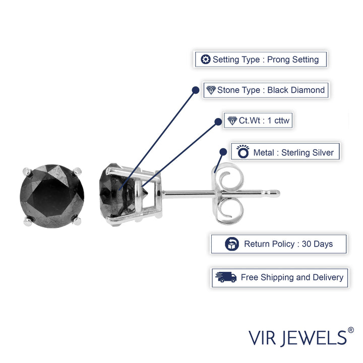 1 cttw Black Diamond Stud Earrings .925 Sterling Silver Round with Push Backs