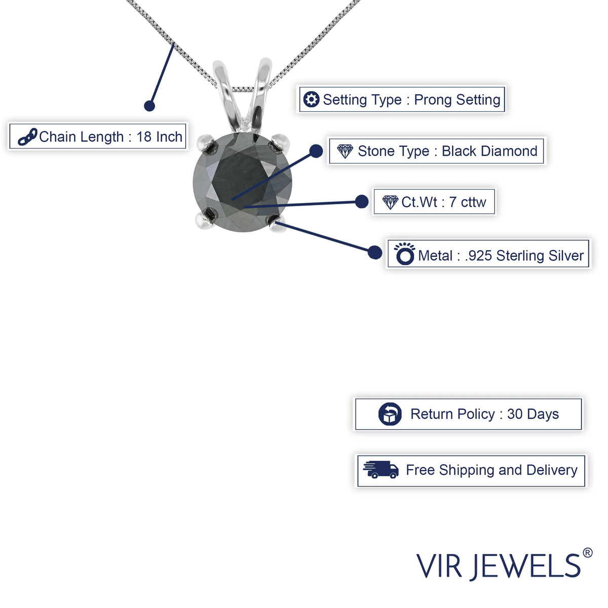 Handcrafted in .925 sterling silver with rhodium plating, featuring a 7.00 cttw round black diamond. Prong setting. Pendant dimensions: Approximately 0.20 inches in length. Includes an 18-inch sterling silver chain.