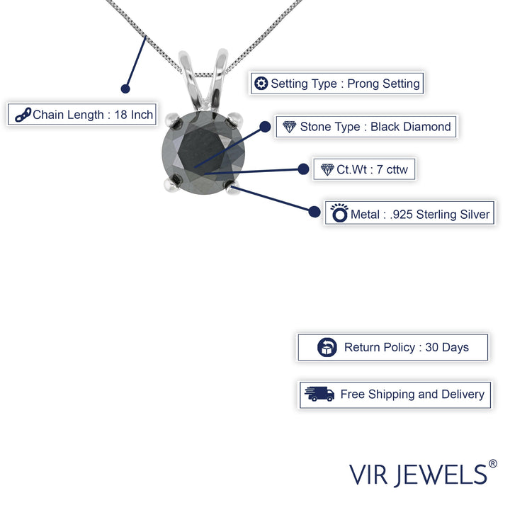 7 cttw Black Diamond Solitaire Pendant .925 Sterling Silver Round with Chain