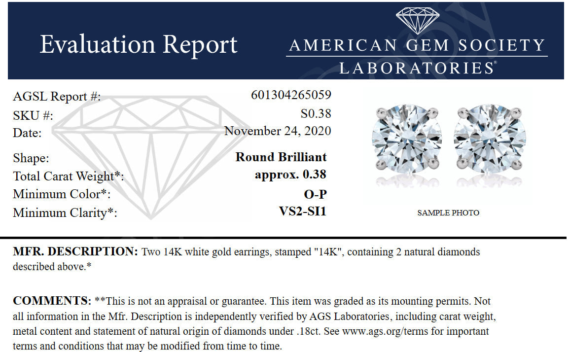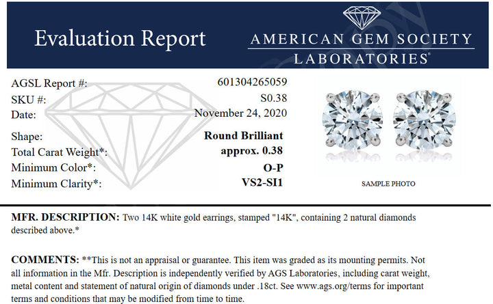 14K white or yellow gold with 0.25 to 2.00 cttw round diamonds. Diamond clarity: VS2-SI1. Diamond color: O-P. Screw backs. Certified.