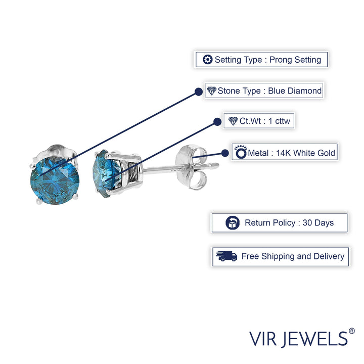 1 cttw Blue Diamond Stud Earrings 14K White Gold Round Shape with Push Backs Prong Set