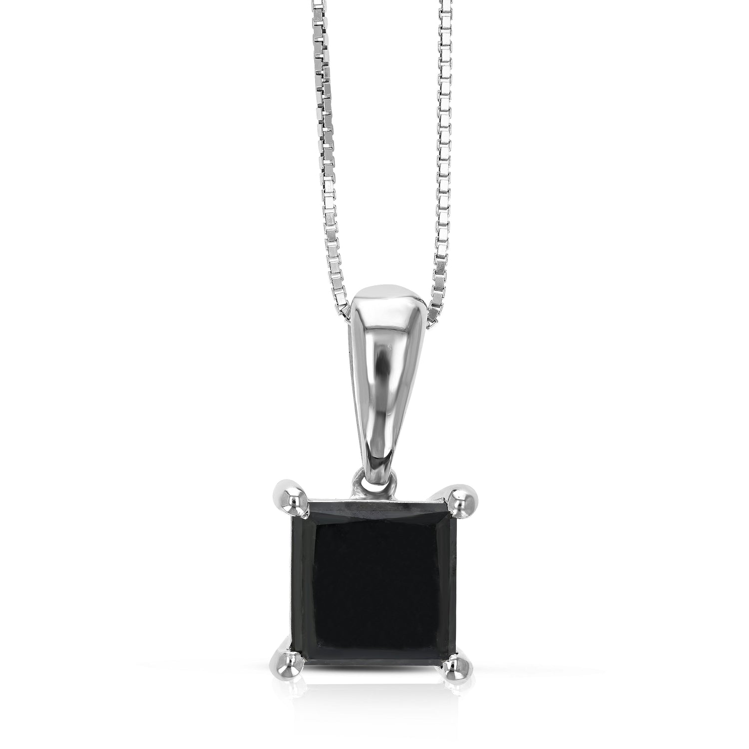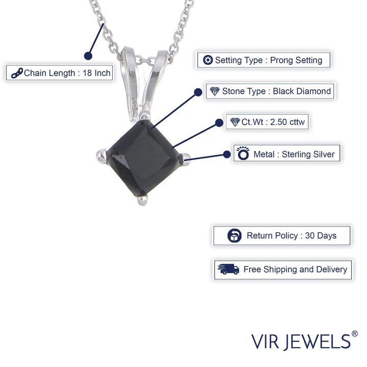 2.50 cttw princess-cut natural black diamond with I1-I2 clarity. Set in .925 sterling silver with a high-polish finish. Pendant dimensions: 7mm width, 17mm length. Includes an 18-inch sterling silver chain. Designed for long-lasting wear and durability.
