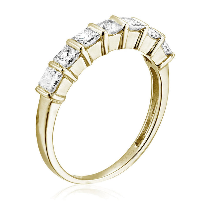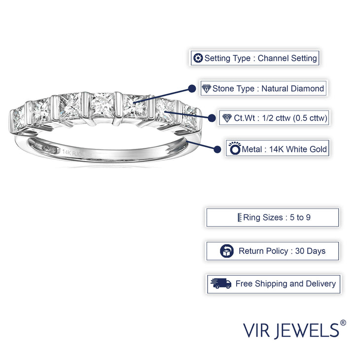 This 1/2 cttw Princess Cut Diamond Wedding Band for Women in 14K White Gold by Vir Jewels features a channel setting with natural diamonds set in bars. Available in multiple sizes, this elegant band showcases 6 or 7 dazzling princess-cut diamonds, each contributing to the total 1/2 cttw. A perfect addition to any bridal set, this ring will stand out with its refined beauty and timeless appeal.