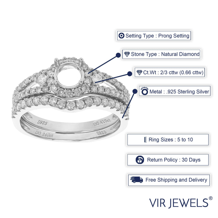 The 2/3 cttw Diamond Semi Mount Bridal Set in Sterling Silver by Vir Jewels offers a dazzling design for your special day. Featuring 2/3 cttw of natural diamonds in sterling silver, this bridal set allows you to personalize it with a 5.40mm (0.65 ct) round shape diamond at the center. The round diamonds add brilliance and elegance, while the classic sterling silver band provides a timeless foundation for your chosen stone. This set is a beautiful symbol of love and commitment.