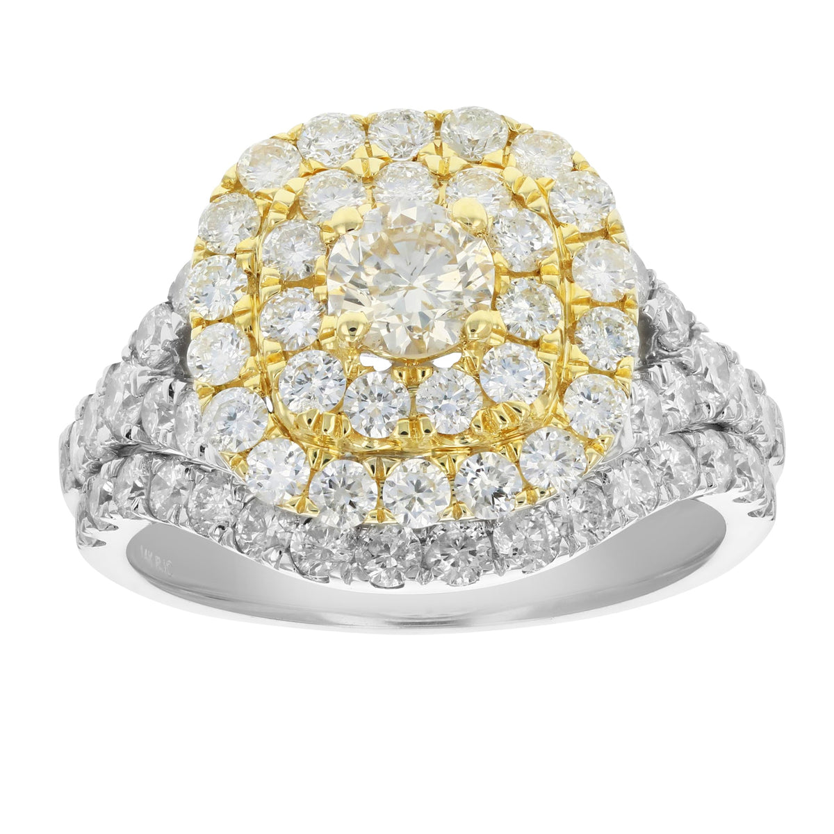 Crafted in 14K yellow gold with 60 round-cut natural diamonds. Center diamond weight: 0.34 cttw, side diamond weight: 1.53 cttw. Diamond color: J-K, clarity: I1-I2. Ring width: 7mm.