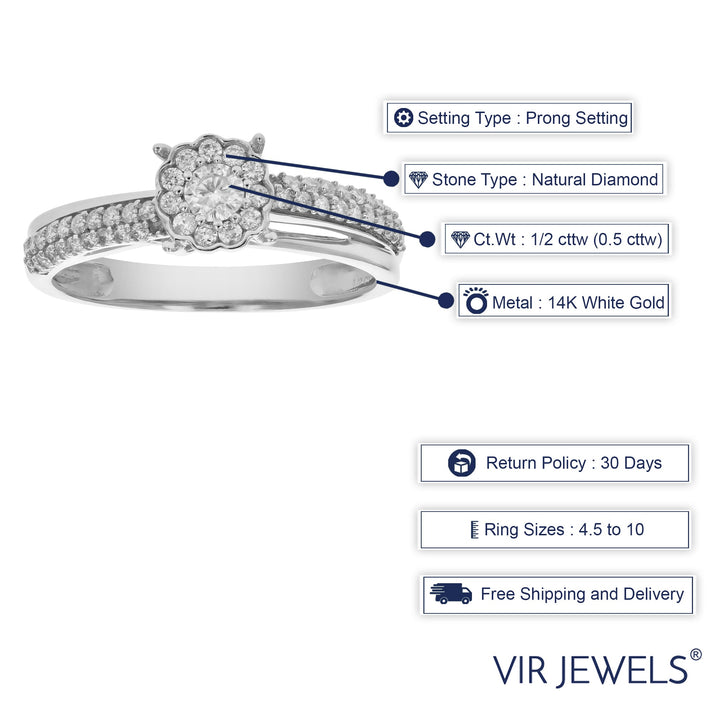 These 1/2 CTTW Diamond Engagement Ring by Vir Jewels exude timeless elegance, crafted to symbolize love and commitment. Designed with 51 dazzling natural diamonds, this piece features a radiant composite cluster setting that enhances its brilliance. The center diamond, weighing 0.14 cttw, is complemented by 0.36 cttw of sparkling side stones, creating a captivating display of light and luxury. The 14K white gold band adds a sleek, sophisticated touch, making this an exquisite choice for an engagement or wedding ring. With a 6mm width and 18mm length, this ring is a stunning expression of everlasting devotion.