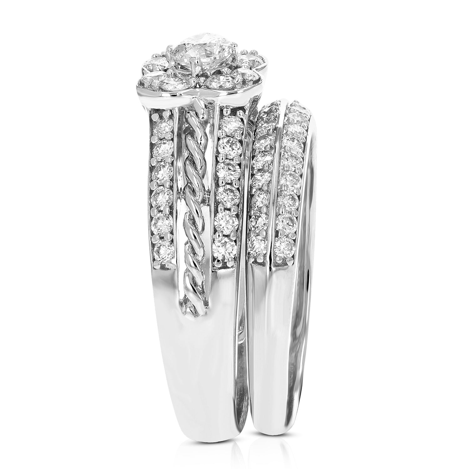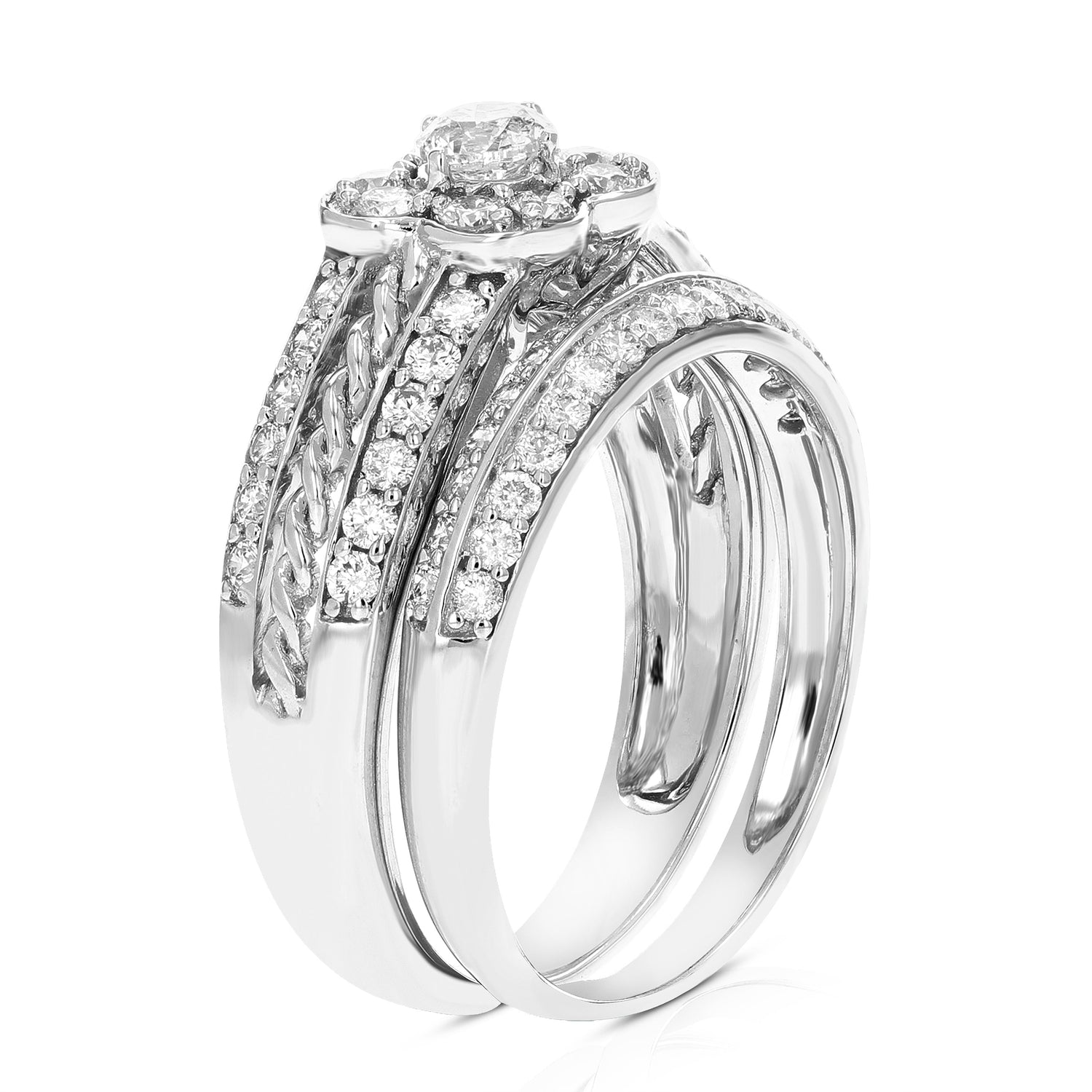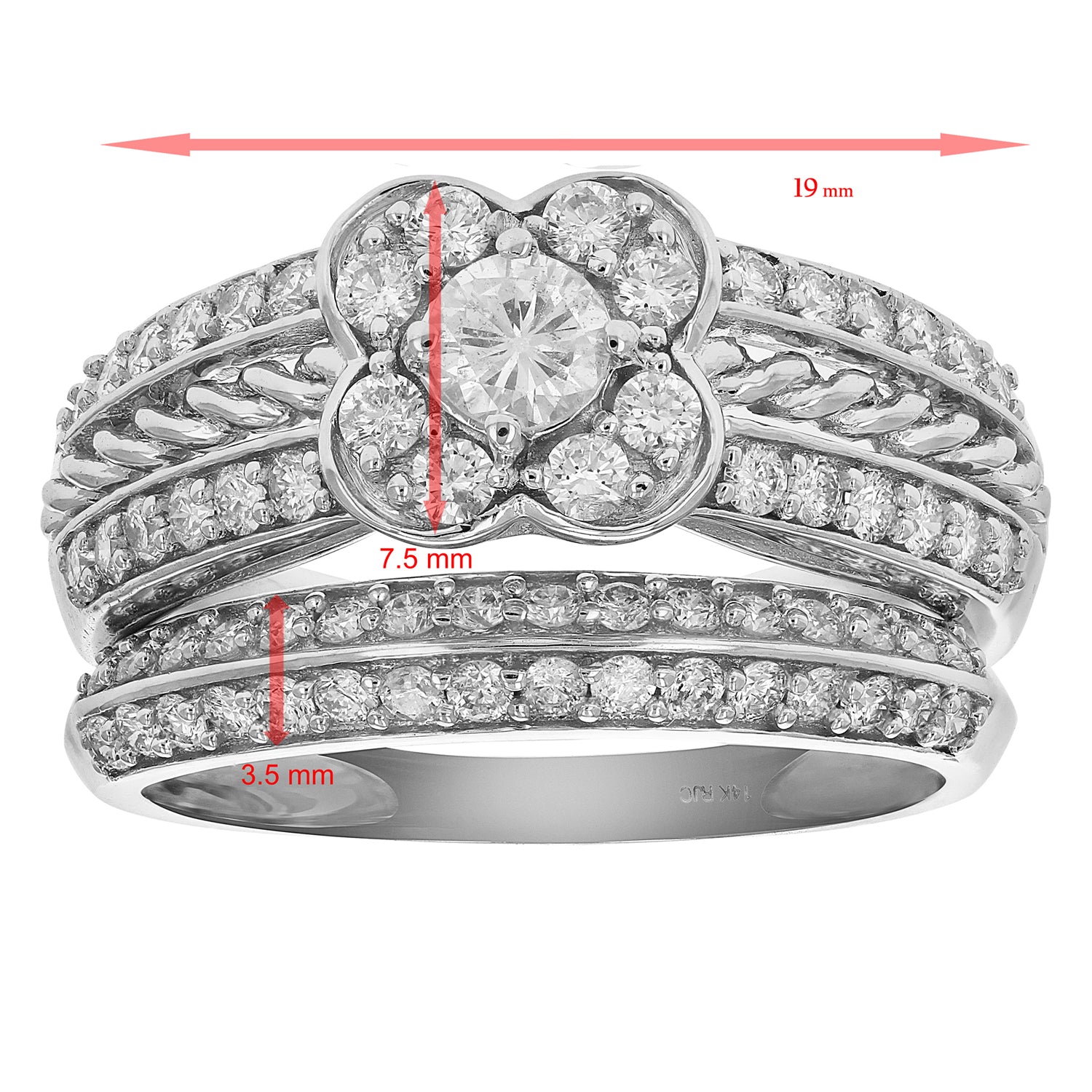 1 cttw Diamond Two Row Flower Wedding Engagement Ring Set 14K White Gold Bridal