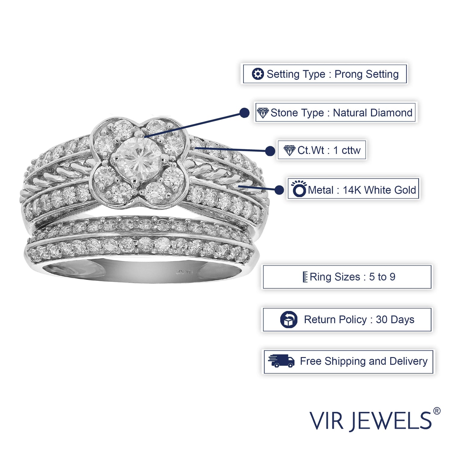 This 1 cttw Diamond Two Row Flower Wedding Engagement Ring Set in 14K White Gold by Vir Jewels is a symbol of eternal love and commitment. The set features 65 dazzling diamonds in a prong setting, with the center diamond weighing 0.23 ct. t.w. and the side diamonds totaling 0.77 ct. t.w. The intricate two-row design of the ring is crafted in high-quality 14k white gold, offering a sophisticated and luxurious look. This set includes an engagement ring and a matching wedding band, making it the perfect choice for couples looking for a classic and meaningful symbol of their love.