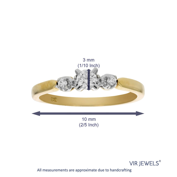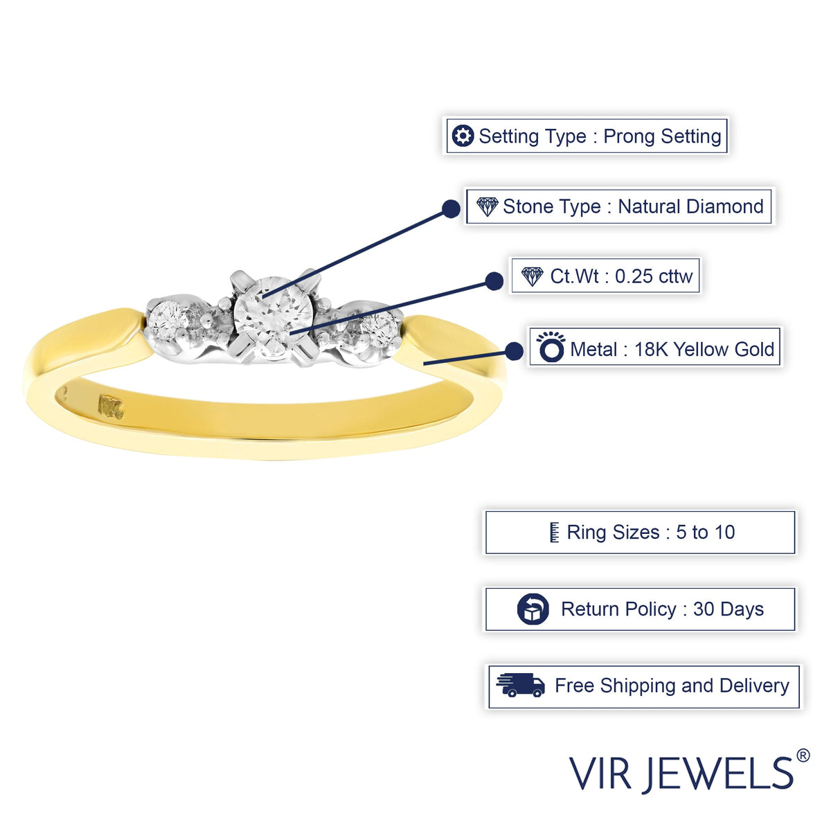 This 0.25 cttw Diamond 3 Stone Ring in 18K Yellow Gold by Vir Jewels is a symbol of love and elegance. With three round diamonds (0.25ctw) set in a classic three-stone design, this ring represents past, present, and future. Crafted in rich 18K yellow gold, this engagement ring is a timeless piece that makes a memorable statement.