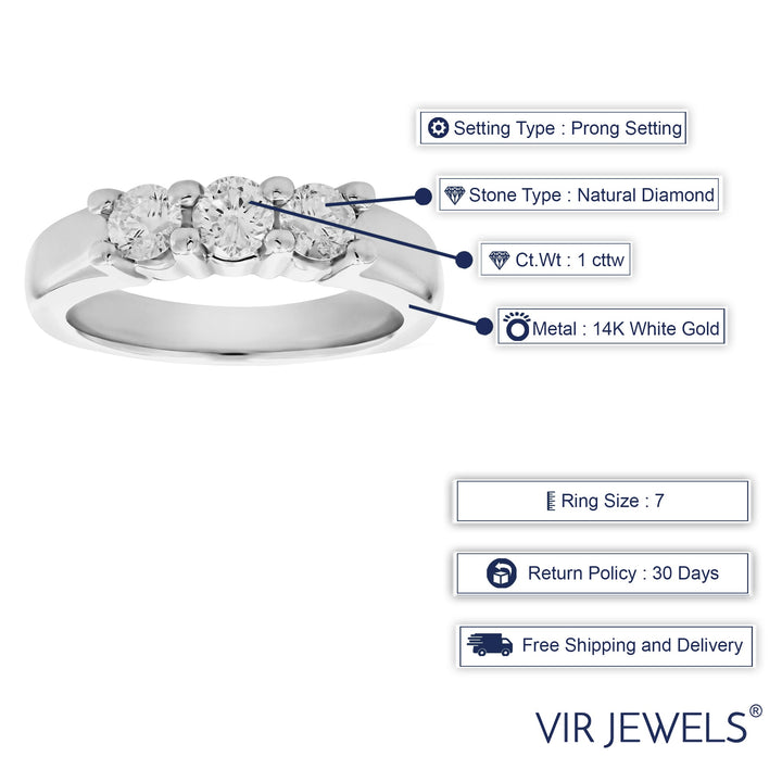 This 1 cttw Diamond 3 Stone Ring in 14K White Gold by Vir Jewels is a timeless representation of love and commitment. Featuring three natural diamonds set in a classic design, this ring is a symbol of lasting beauty. Its elegant 14k white gold setting ensures a sophisticated look for any special occasion.