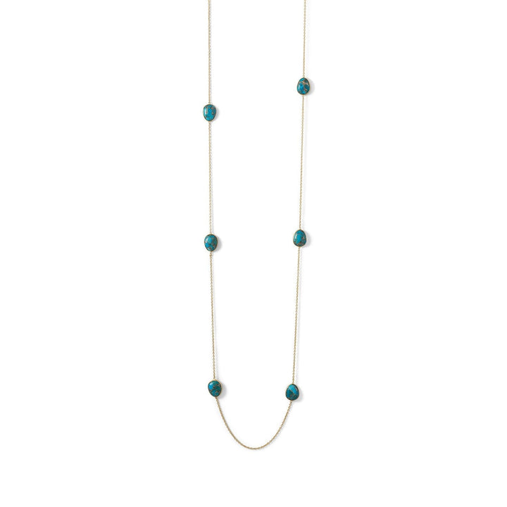 Made with 18k gold over sterling silver, featuring an 8mm x 11mm turquoise stone. Necklace measures 36” in length.