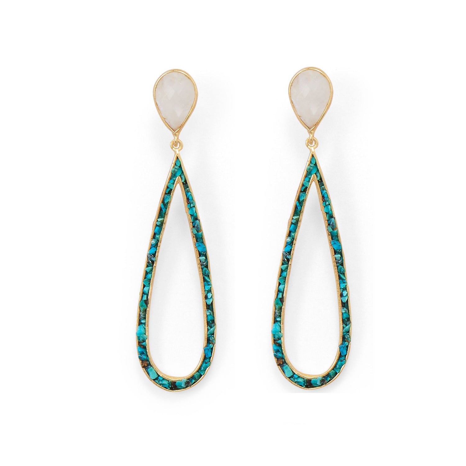18k gold over sterling silver with natural rainbow moonstone and turquoise gemstones. Secure hook closure, with a total earring length of 2 inches.