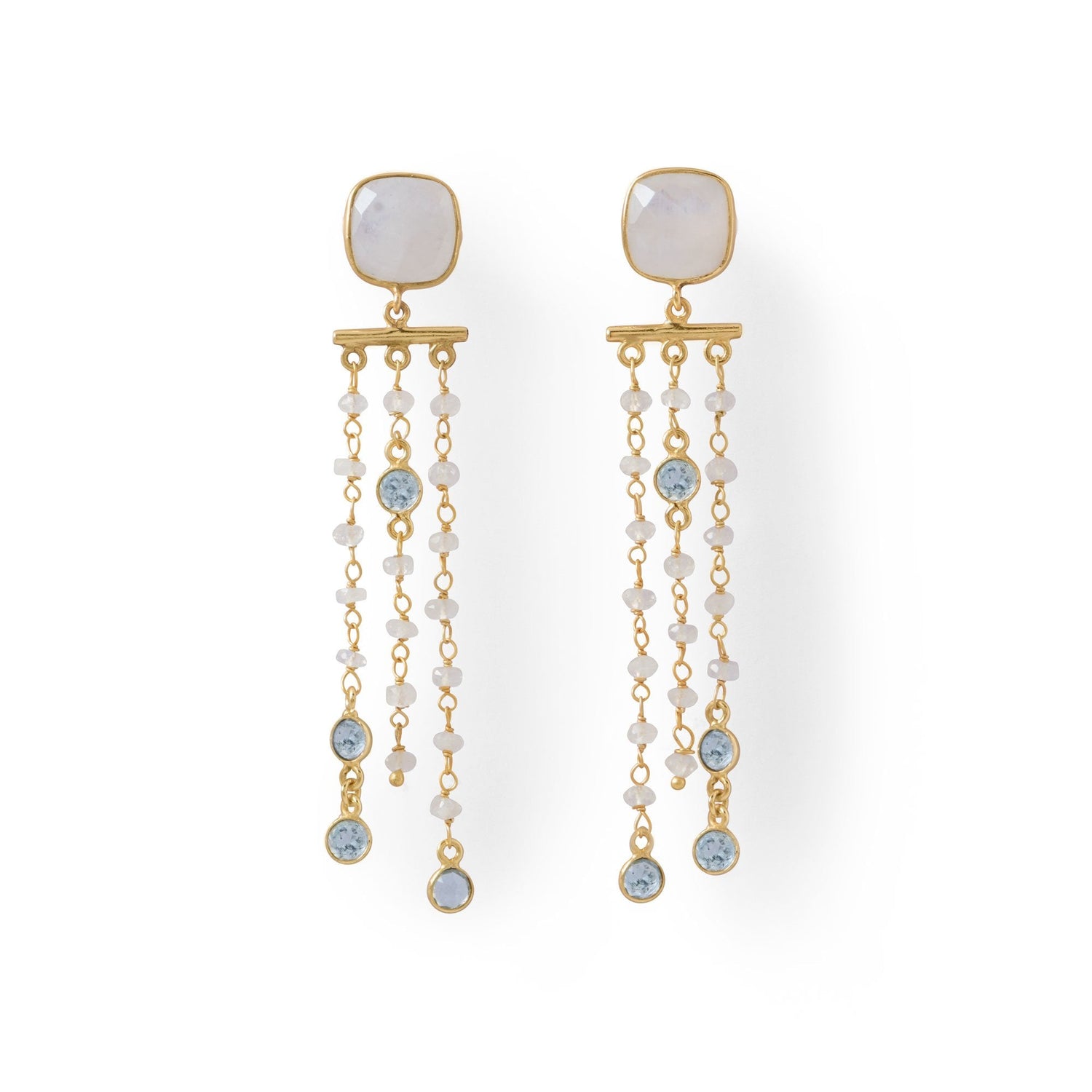 Crafted in 18K gold over sterling silver with rainbow moonstone and blue topaz stones. Earrings measure 2.85 inches in length.