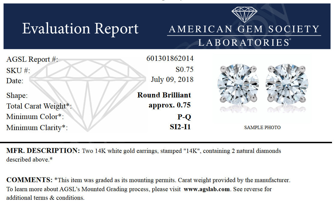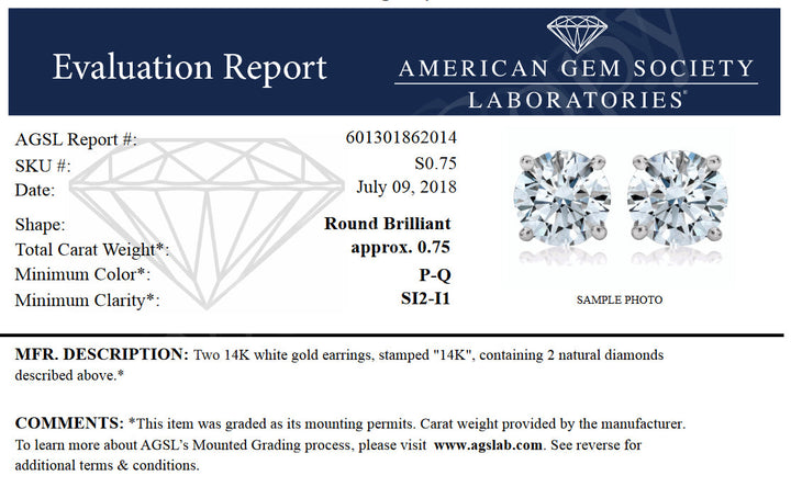 Crafted in 14K white gold with natural round-cut diamonds. Diamond carat weight: 3/4 cttw (0.75 cttw). Diamond color: L-M, clarity: I1-I2. Screw-back closure.