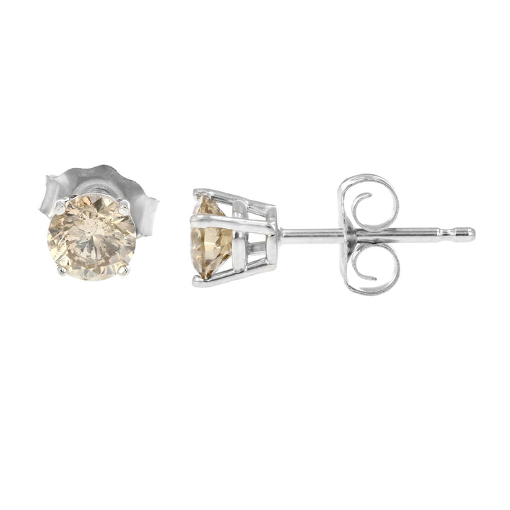 Crafted in 14K white gold, these earrings feature round brilliant-cut champagne diamonds totaling 1.00 cttw. Diamond color: S-T (Champagne), clarity: I1-I2. Earring dimensions: 5mm x 5mm. Butterfly clasp.