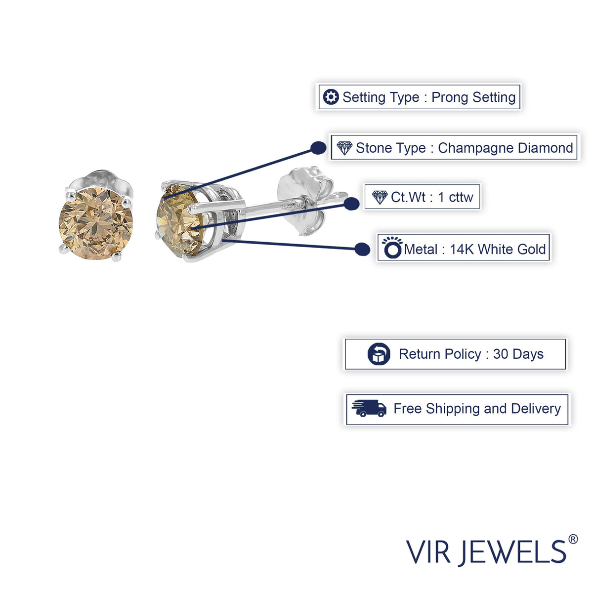 These 1 cttw Champagne Diamond Stud Earrings in 14K White Gold from Vir Jewels feature round brilliant-cut champagne diamonds, offering a unique twist on the classic stud earring. The warm, natural tones of the champagne diamonds (S-T color) shine through, set in high-quality 14K white gold. The earrings' total carat weight is 1.00 cttw, providing just the right amount of sparkle. Perfect for adding a touch of sophistication to any outfit, these earrings are a timeless addition to your jewelry box.