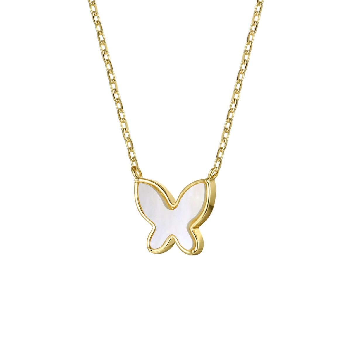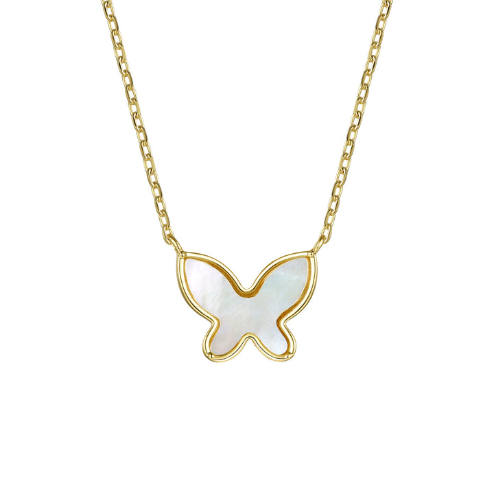 Made with 14k yellow gold-plated sterling silver, featuring a bezel set mother of pearl butterfly inlay. Finished with a lobster clasp.