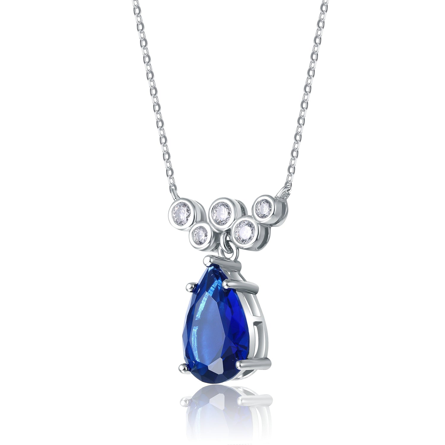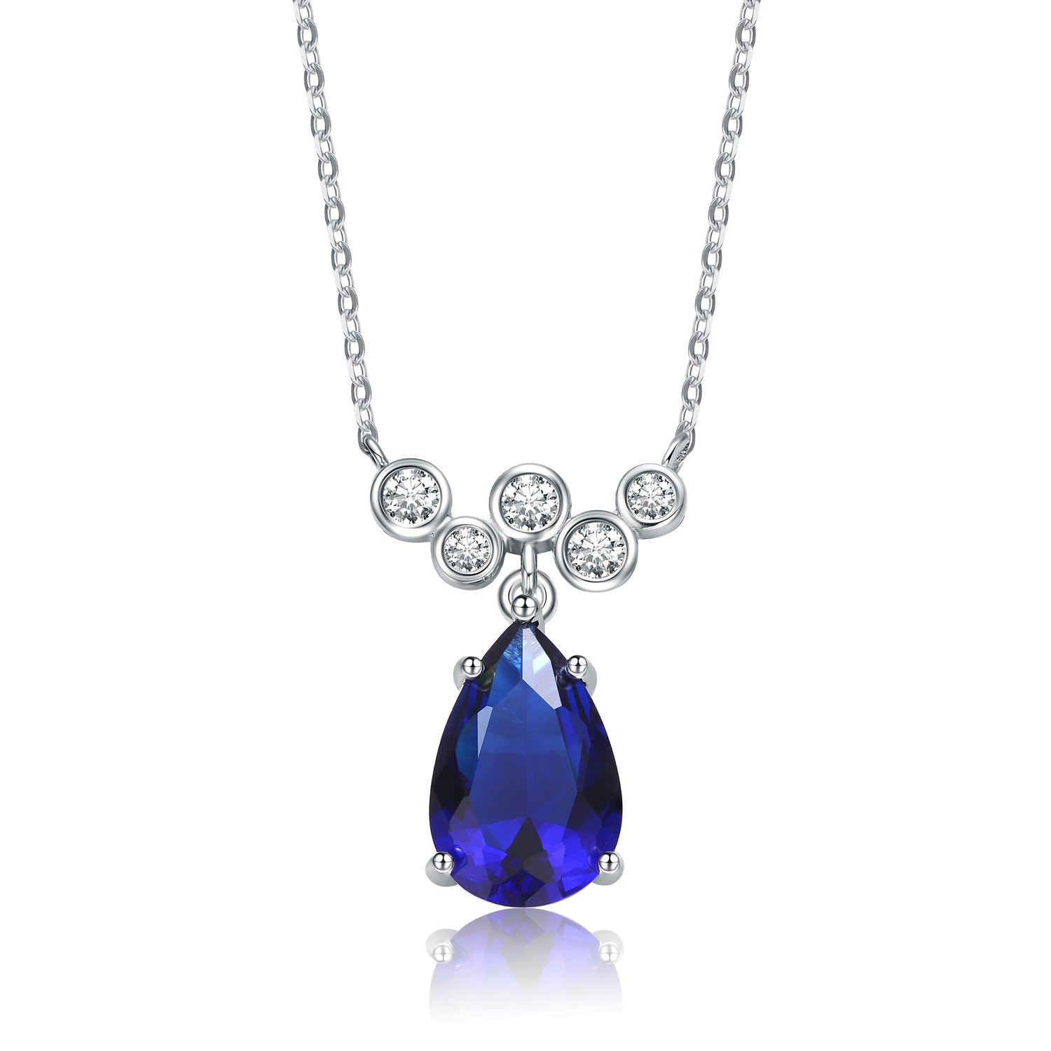 This Blue Sapphire & Diamond Cubic Zirconia Bubble Chevron Raindrop Necklace by Genevive Jewelry captures the essence of modern royalty. A deep royal blue sapphire dangles from a chevron design adorned with brilliant diamond cubic zirconias, all gracefully arranged on a sleek cable chain. Finished in white gold-plated sterling silver, this piece is the perfect balance of regal beauty and everyday wearability.