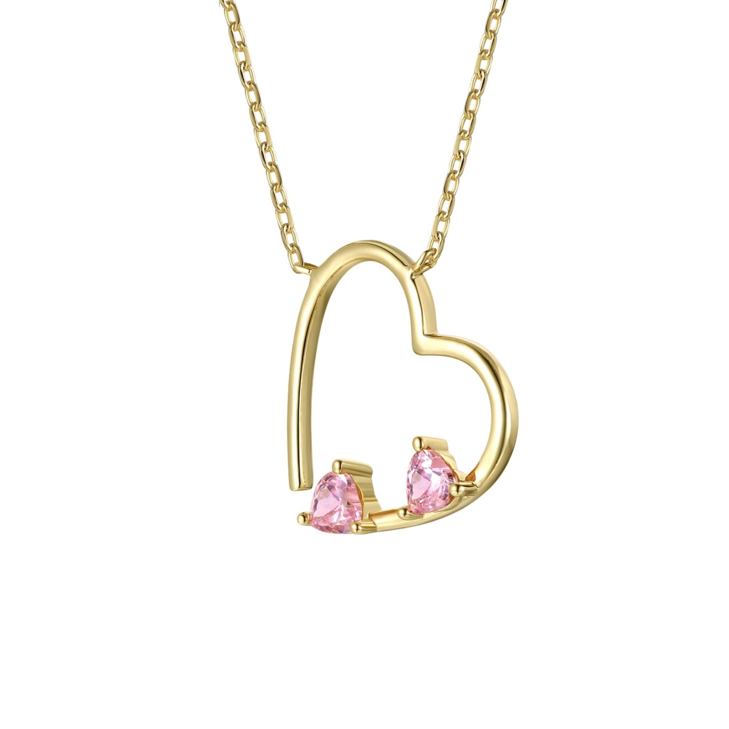 This 14K Gold Plated Sterling Silver with Pink Diamond Cubic Zirconia Open Heart Layering Necklace by Genevive Jewelry features two sparkling pink diamond cubic zirconia stones set in an open heart design, making it a perfect romantic gift. The delicate cable chain and lobster clasp ensure a secure fit, while the gold plating adds warmth and shine. Ideal for layering with other pieces, this necklace is a sweet and meaningful addition to any collection.