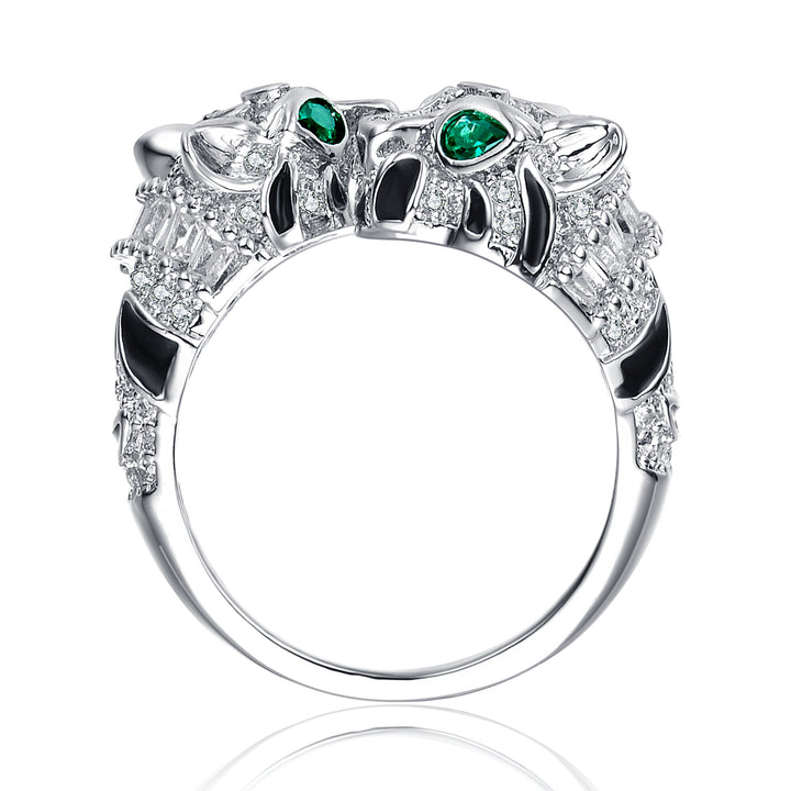 This Ra Rhodium Plated Panther Bypass Ring by Genevive Jewelry is a striking representation of fierce elegance. Designed in a bypass style, the ring features two panther-shaped ends, each adorned with sparkling cubic zirconia stones. The panther motif, with emerald green pear-shaped cubic zirconia and black inlay details, symbolizes strength, beauty, and stealth. The platinum-plated finish adds to the luxurious nature of the piece, making it an unforgettable accessory. This ring is ideal for making a bold statement and is perfect for any special occasion.