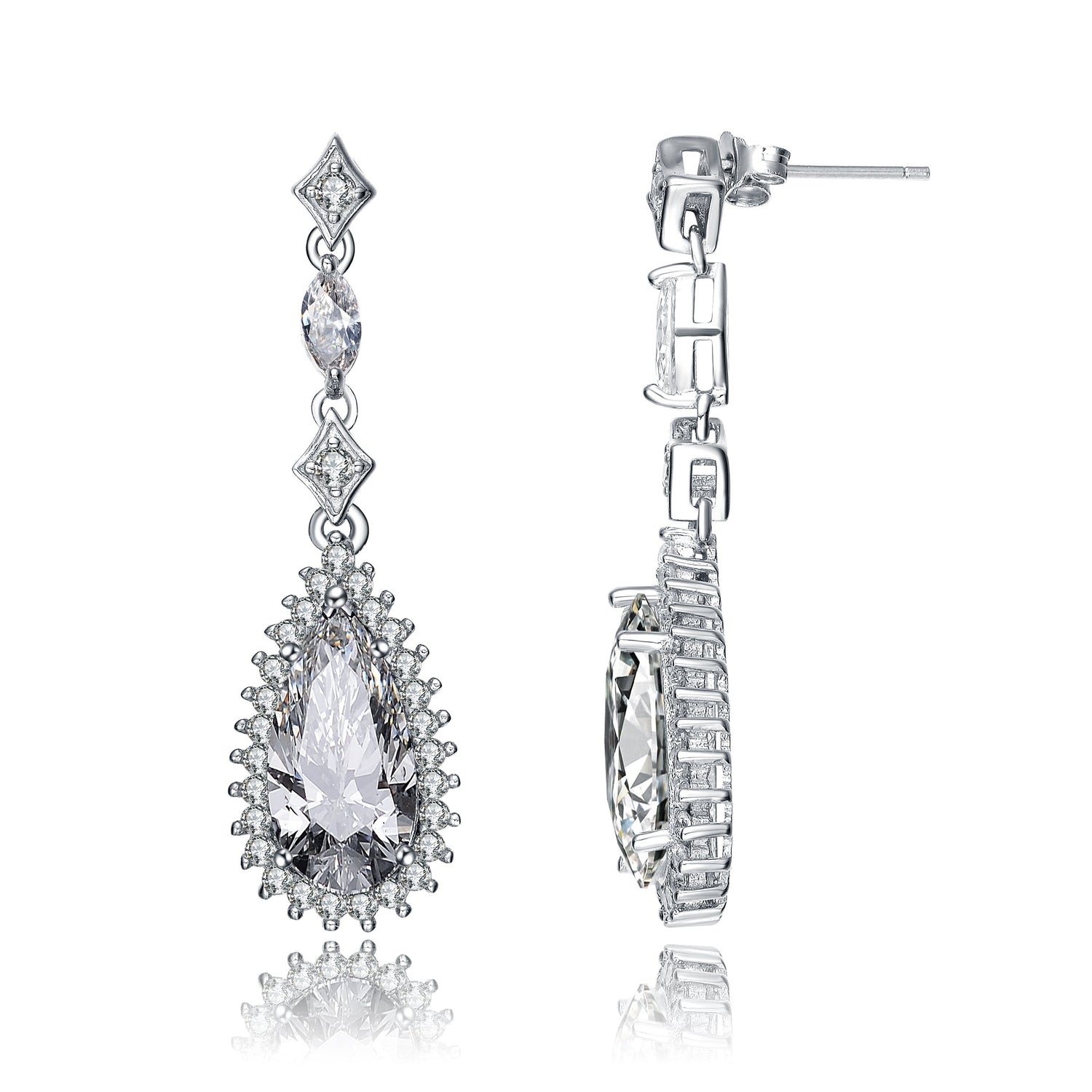 These Sterling Silver Pear Drop Cubic Zirconia with Halo Burst Earrings by Genevive Jewelry are a stunning combination of elegance and sparkle. The pear-shaped cubic zirconia stones are surrounded by a halo of smaller cubic zirconia, creating a radiant and sophisticated look. These earrings are perfect for adding a touch of glamour to any formal event or special occasion.