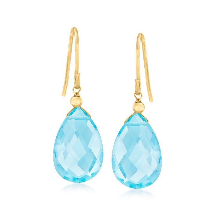 Crafted in 10kt yellow gold, featuring 13.00 ct. t.w. pear-shaped checkerboard-cut sky blue topaz. Earrings measure 3/8' in width with a hanging length of 1 1/8'. Earwire backings.