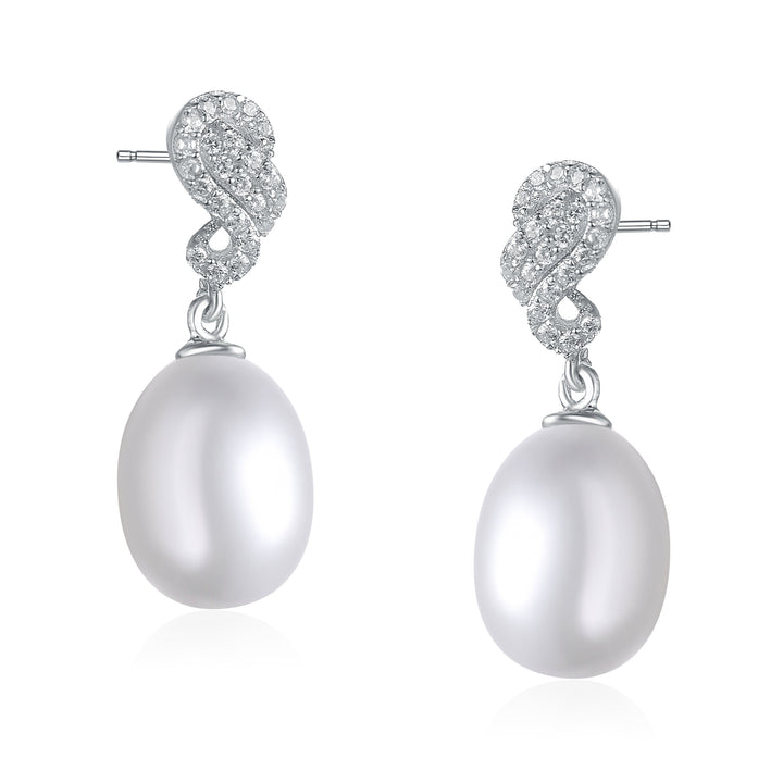 C.z. Sterling Silver Rhodium Plated Swirl Design White Pearl Drop Earrings