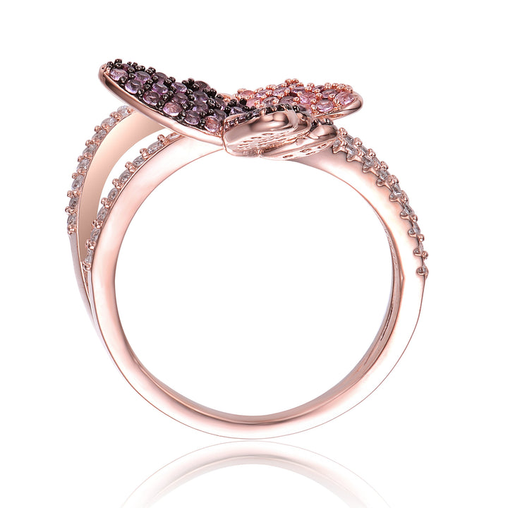 This Multi-Colored Cubic Zirconia Modern Ring by Genevive Jewelry is a stylish and bold piece that adds a contemporary twist to any outfit. Featuring two butterfly designs, one in black-plated prong-set pink cubic zirconias and the other in rose gold-plated pink cubic zirconias, the ring is crafted from sterling silver with both rose gold and black plating. Perfect for stacking or wearing alone, this statement piece is available in sizes 6, 7, and 8.