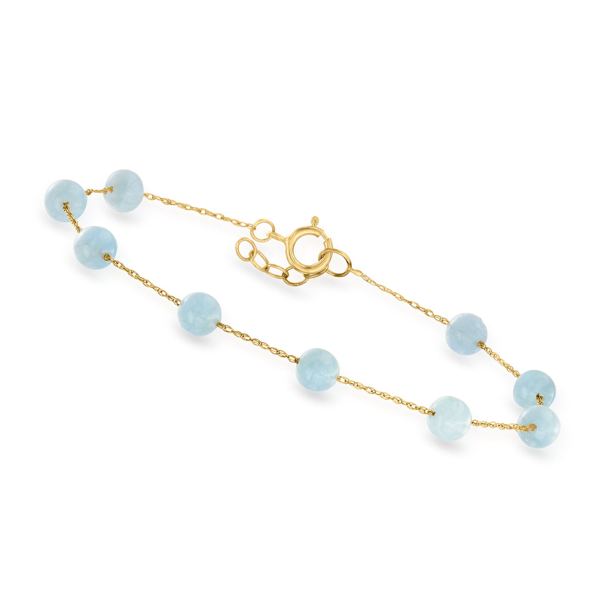 Crafted in 10kt yellow gold, this bracelet features 4-5mm round milky aquamarine beads, with a total gemstone weight of 5.75-6.50 carats. The bracelet length is 6.5 inches, with a 1/2-inch extender, secured with a spring-ring clasp.