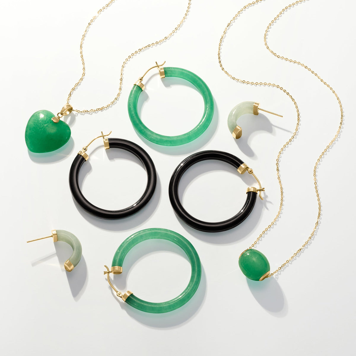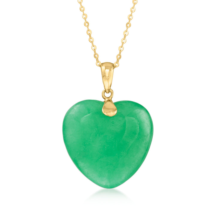 Crafted from 10kt yellow gold. Features a 20x20mm carved jade heart pendant. Chain length: 16 inches. Spring ring clasp closure.