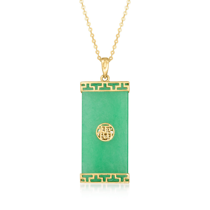 This Canaria Jade 'Good Fortune' Pendant Necklace in 10kt Yellow Gold is a luxurious and meaningful piece. The carved rectangular jade pendant is dyed for a rich green hue, symbolizing good fortune and prosperity. Suspended from a 16-inch 10kt yellow gold chain, the pendant is perfect for layering or wearing alone. With a polished finish and spring-ring clasp, this necklace adds a touch of elegance and symbolism to any outfit.