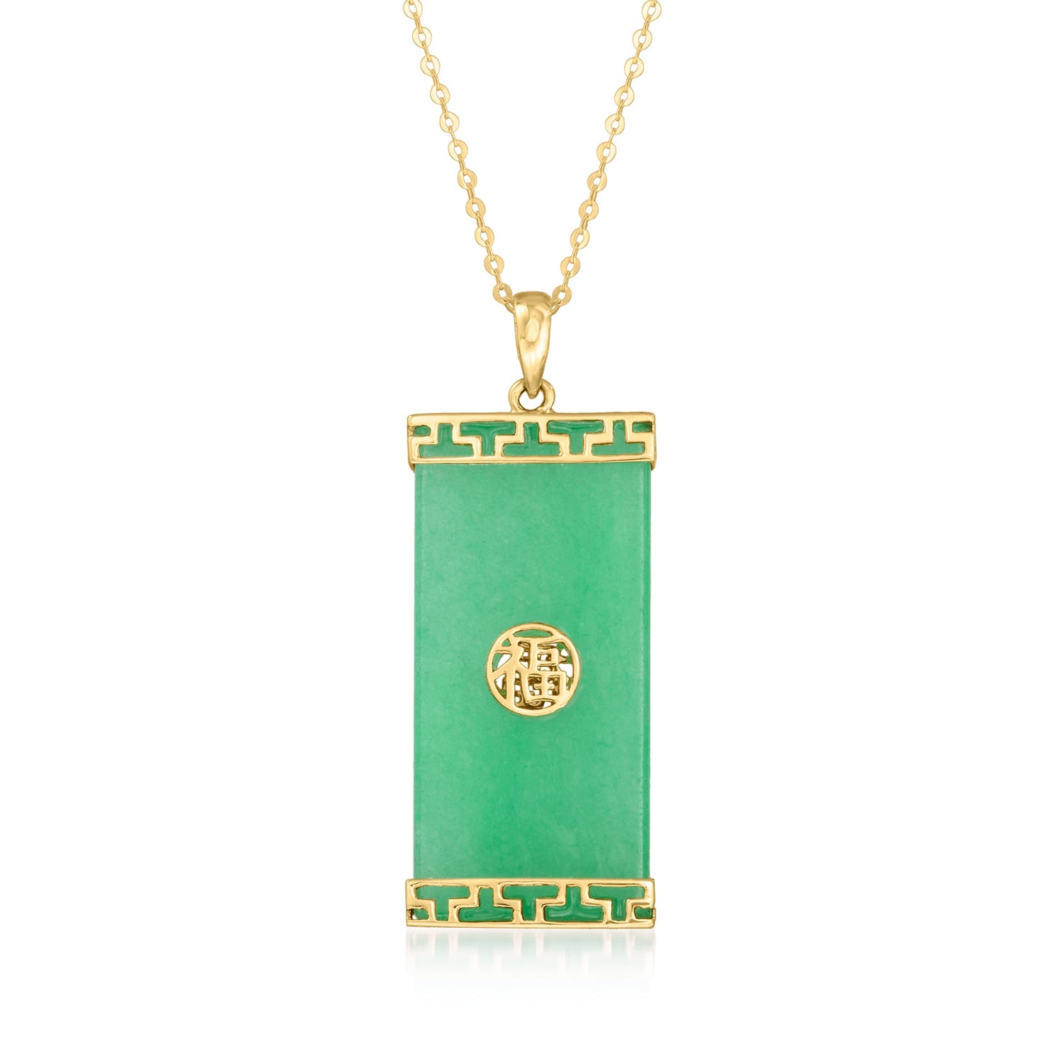 Crafted in 10kt yellow gold with a rectangular carved jade pendant. Pendant size: 1.5 x 0.5 inches; Chain length: 16 inches with a spring-ring clasp.