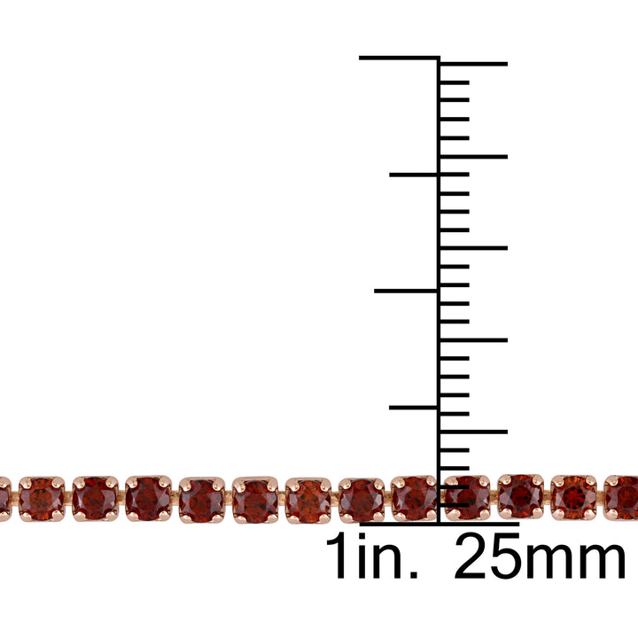 Crafted in rose-plated sterling silver with 44 prong-set round-cut garnets (2.5mm) and 2 bezel-set garnets (3mm). Total gemstone weight: 3 3/4 ct. t.w. Box clasp with slide lock. Bracelet dimensions: 2.8mm wide x 10 inches long x 2.6mm thick.