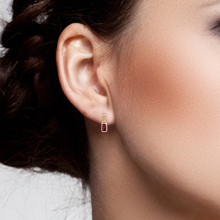 These Octagon Garnet Link Drop Earrings by Mimi & Max are a bold expression of timeless elegance. Crafted in radiant 10k yellow gold, these striking earrings feature bezel-set octagon garnet gemstones and a polished oval link design. With their deep red hue and graceful drop silhouette, they are perfect for adding drama to a date night look.
