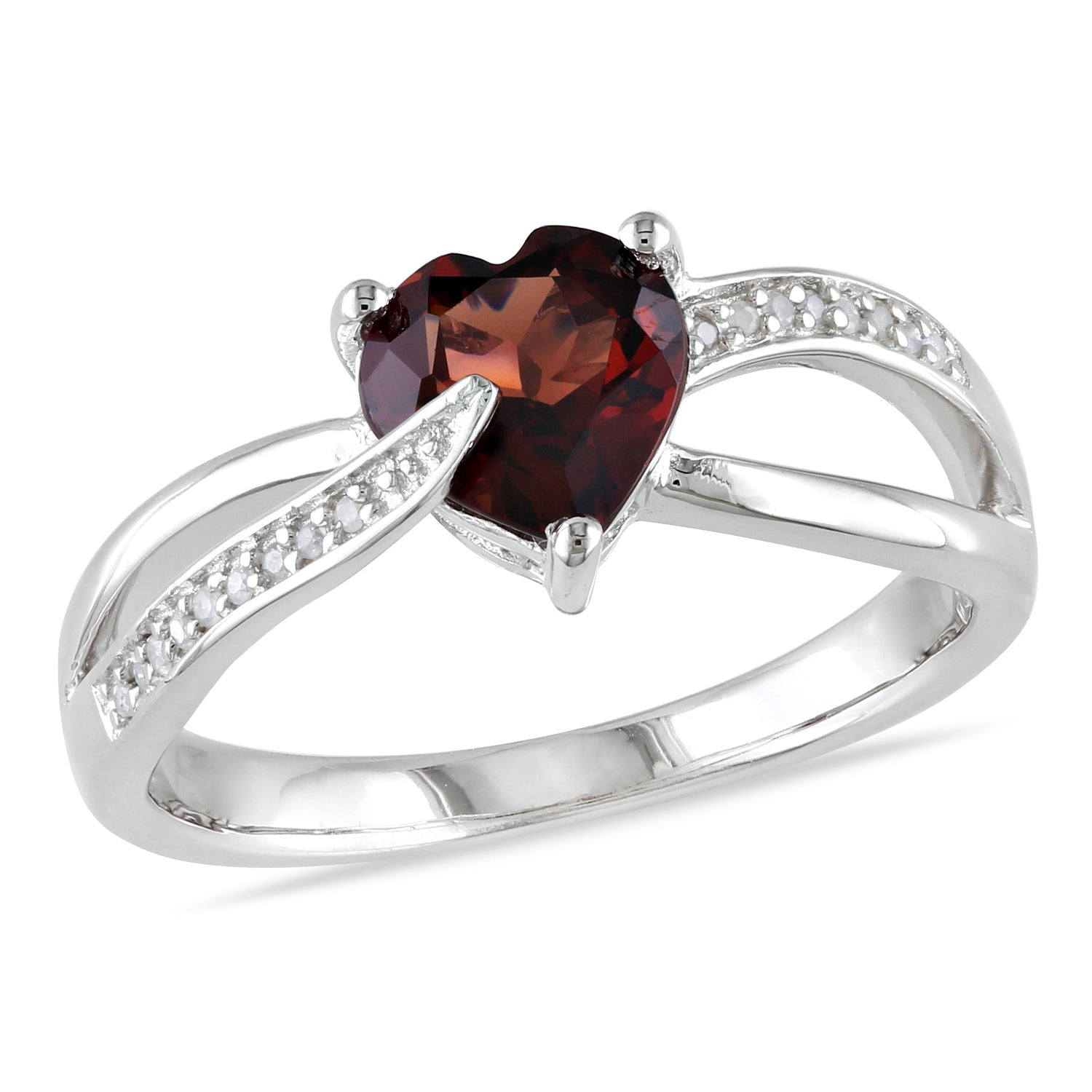 Sterling silver with 7mm heart-shaped garnet and 0.05 cttw round diamonds. Diamond clarity: G-H, I1-I2. Pave setting. Ring dimensions: 19mm wide x 7.7mm long x 7mm high. Band width: 2mm.