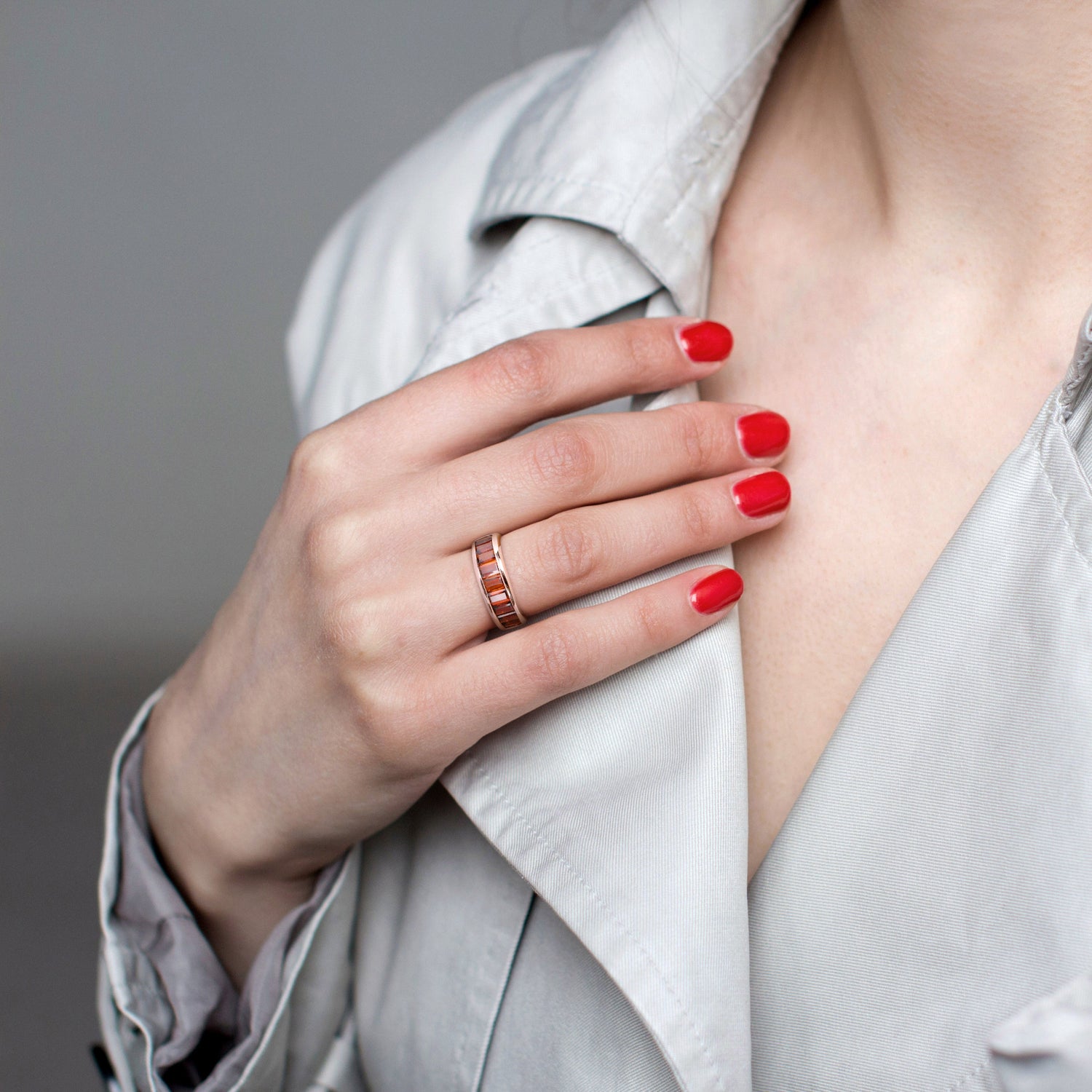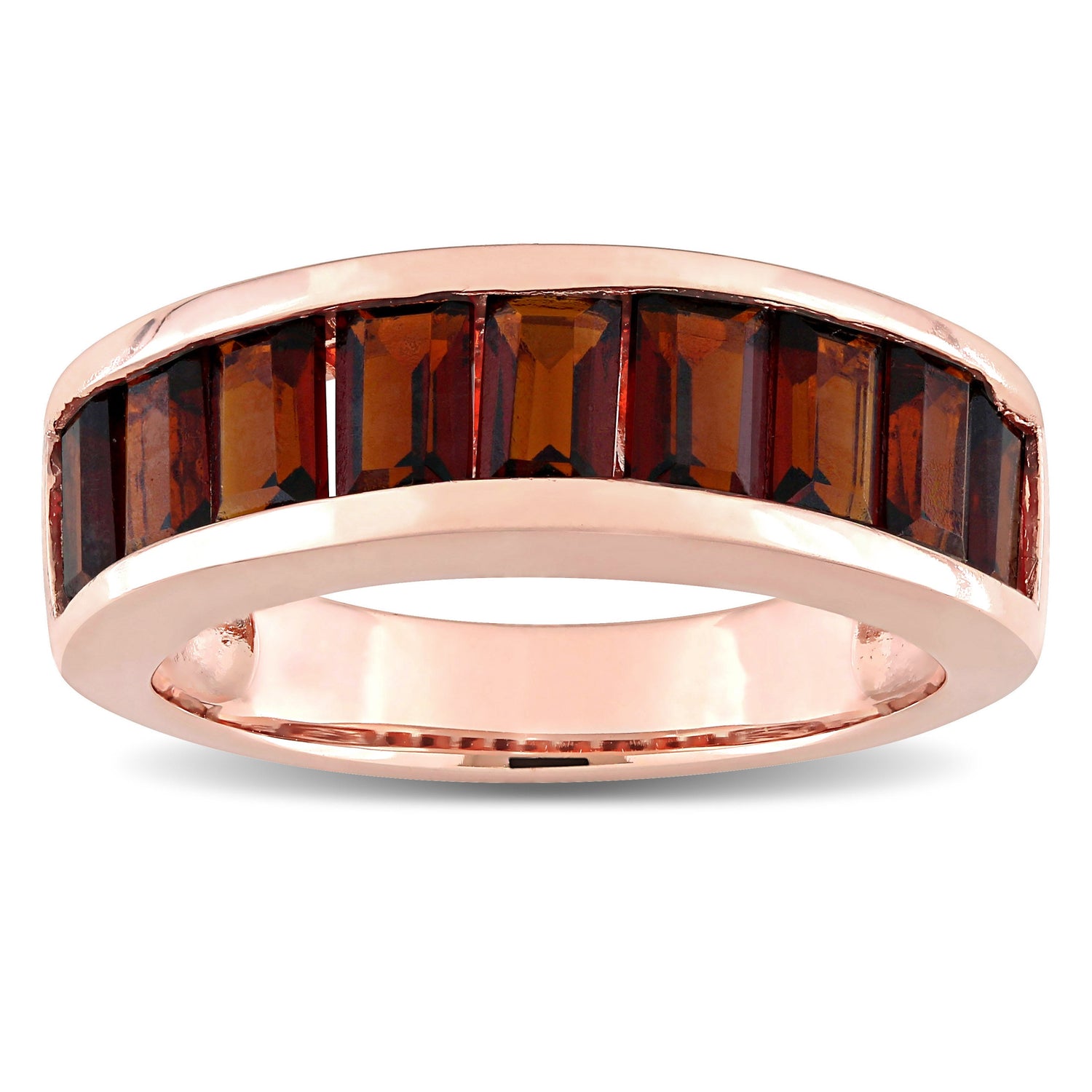 Rose-plated sterling silver. Natural garnet, 3 1/3 cttw. Gemstone cut: Baguette. Setting: Channel. Ring setting dimensions: 6.9mm x 22.4mm x 3.3mm. Band width: 3.6mm. Metal weight: 4.5 grams.